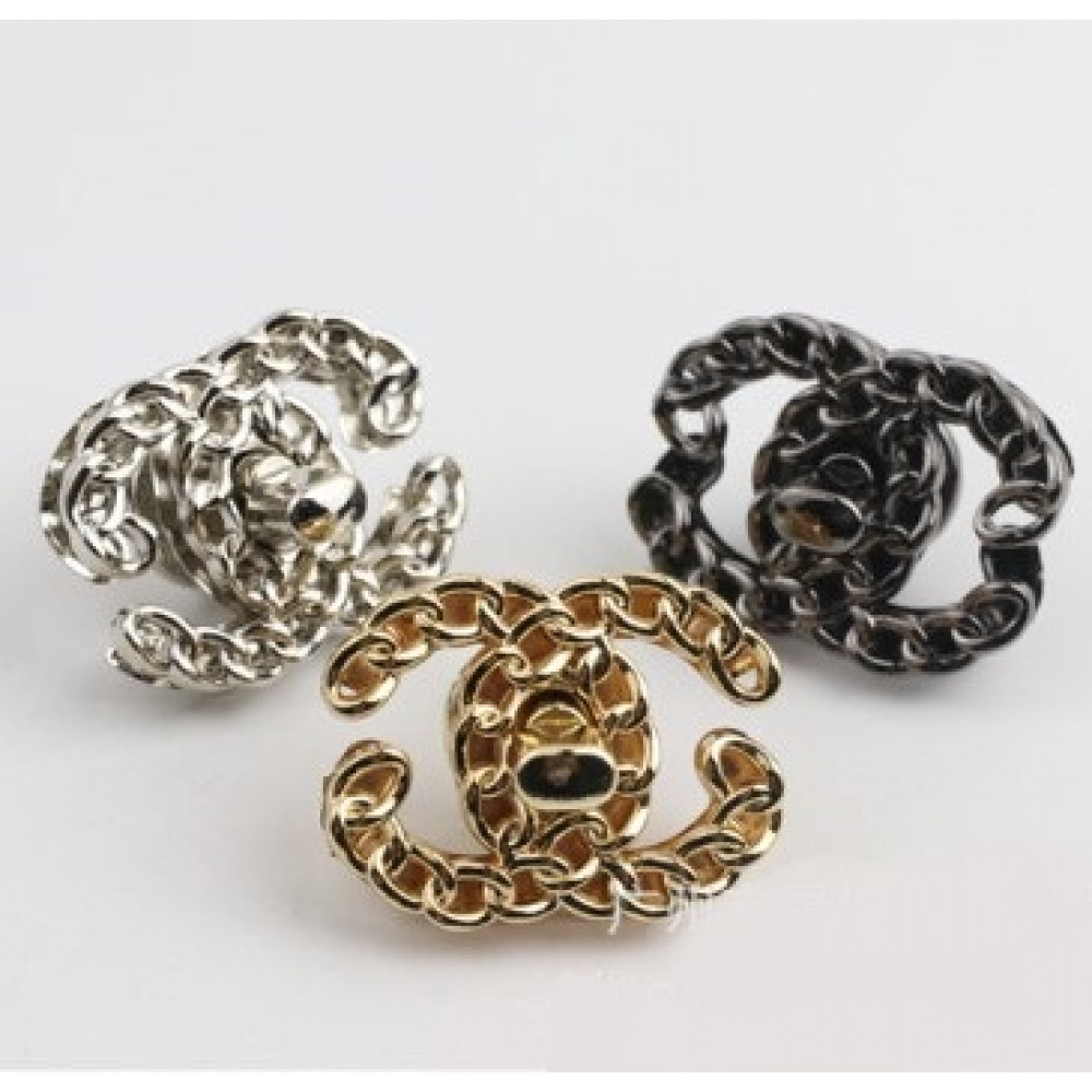 Металлический декоративный замочек с застежкой поворотного типа в виде двух пересекающихся полуокружностей из "цепочки" для галантерейных изделий - сумок, кошельков, портфелей и пр. Такая фурнитура подойдет не только для кожаных изделий, но и для текстильных, вязаных сумок.