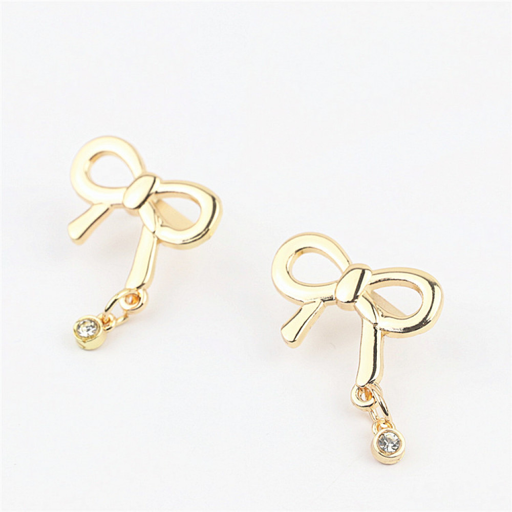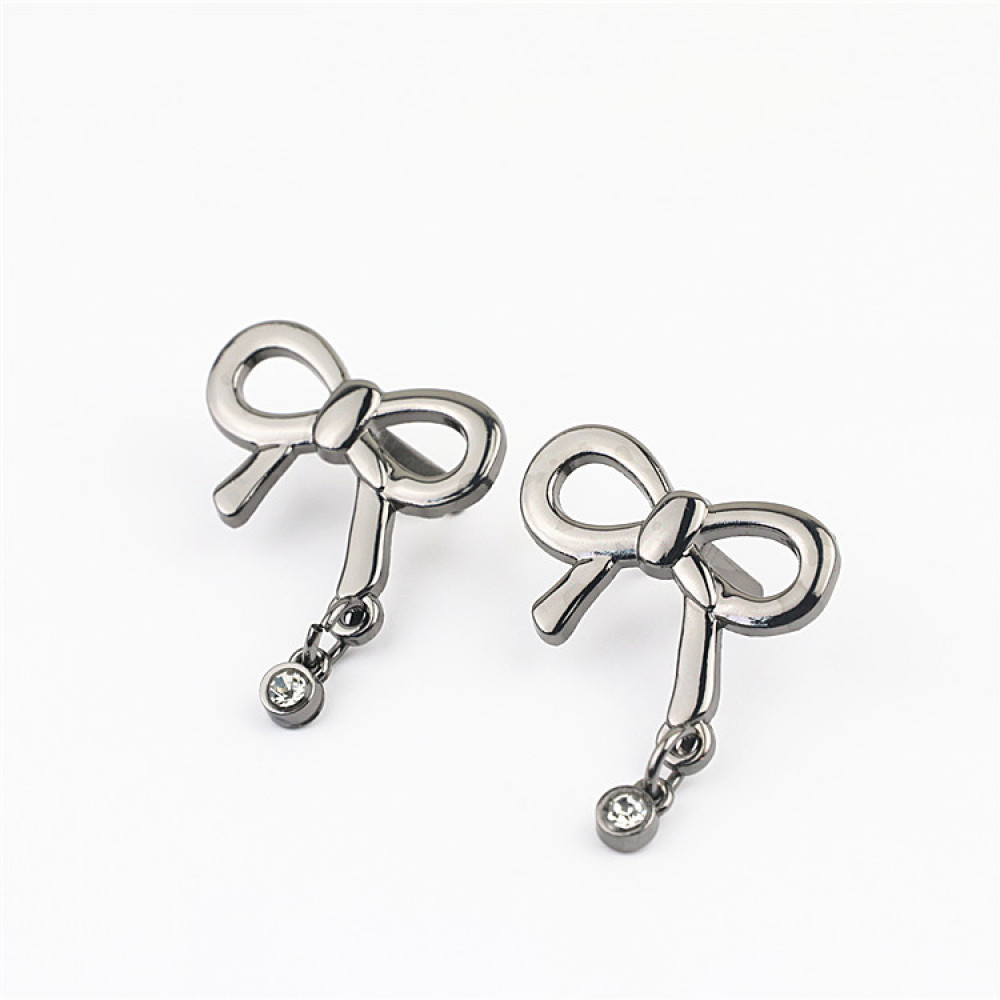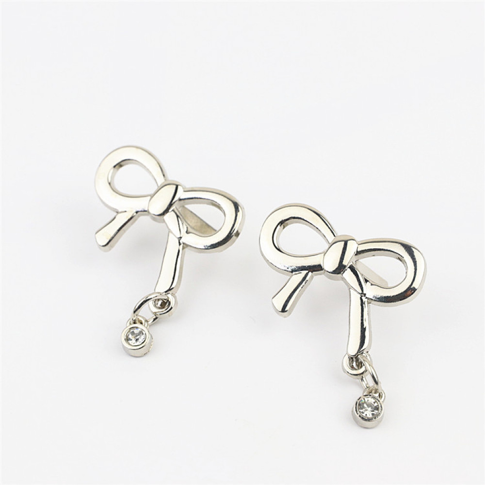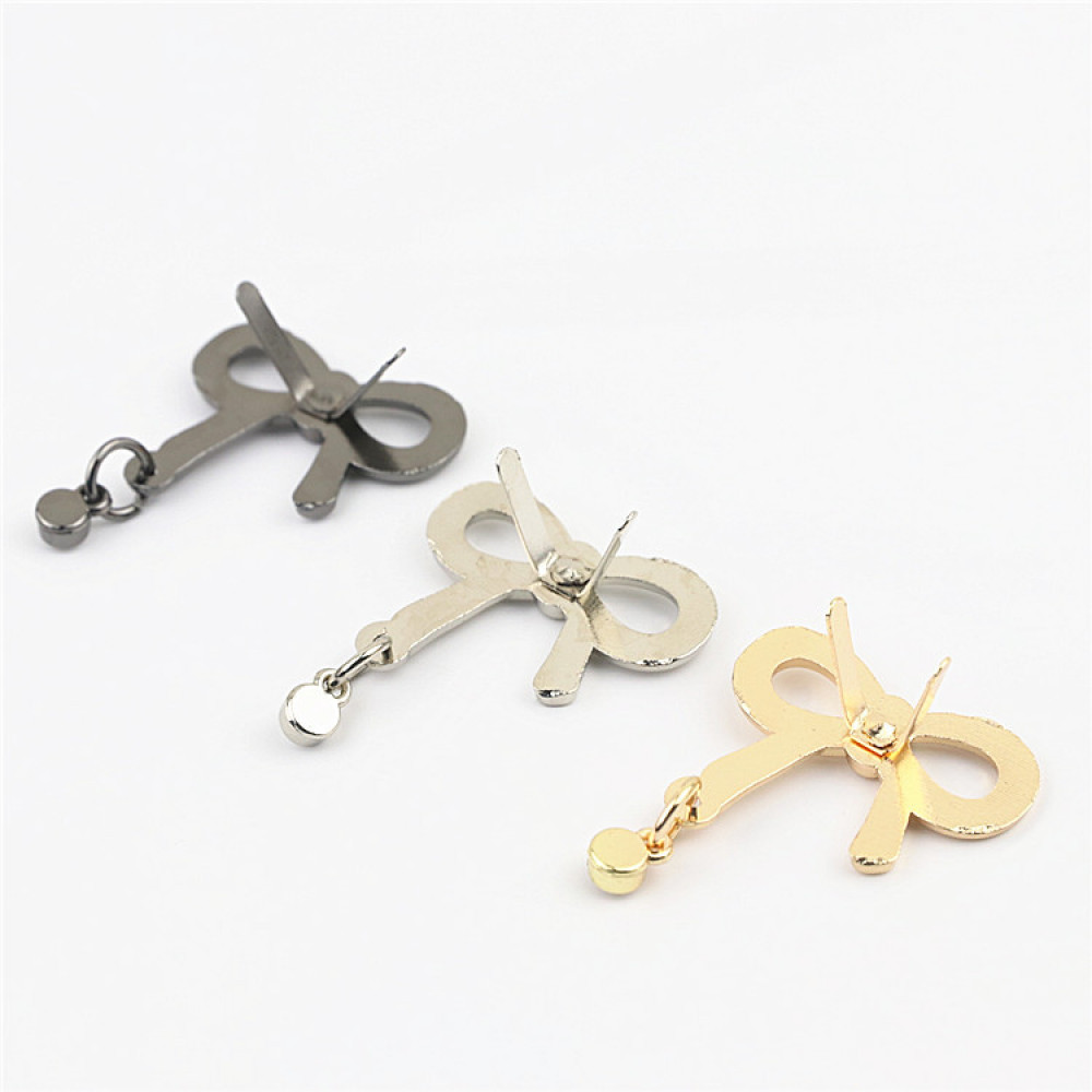 Металлическое украшение для кожи - декоративный зажим в форме бантика с асимметричными концами, с одним стразом