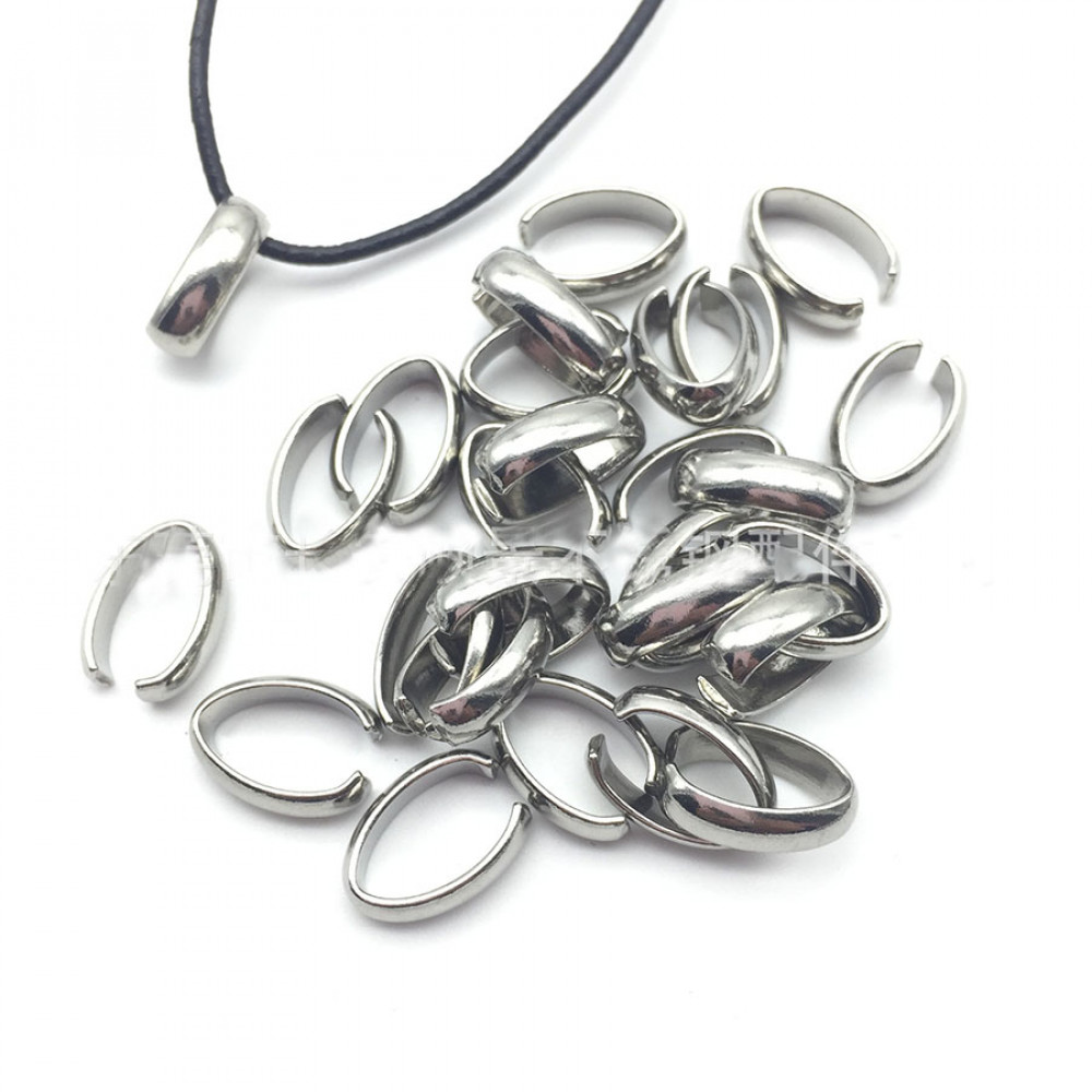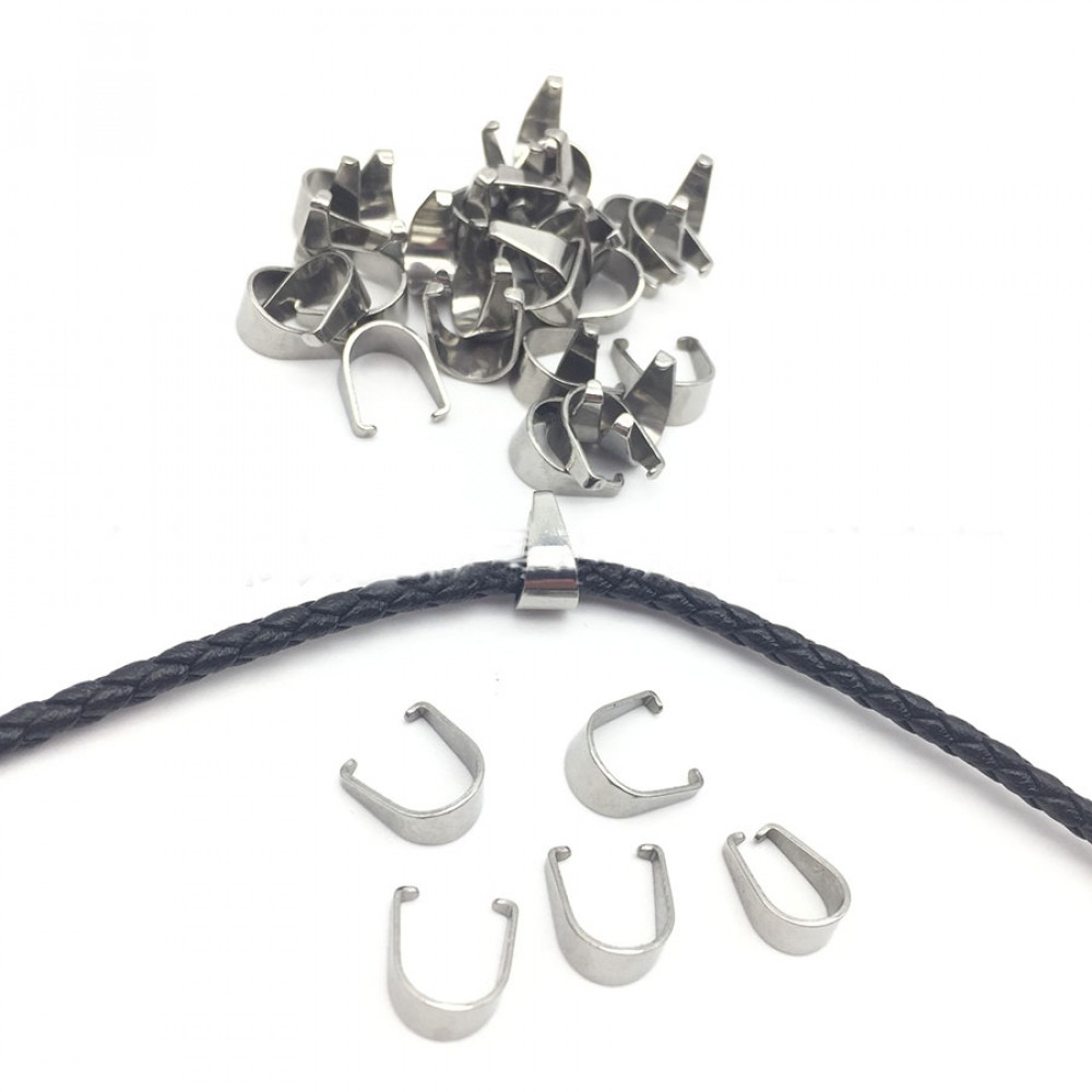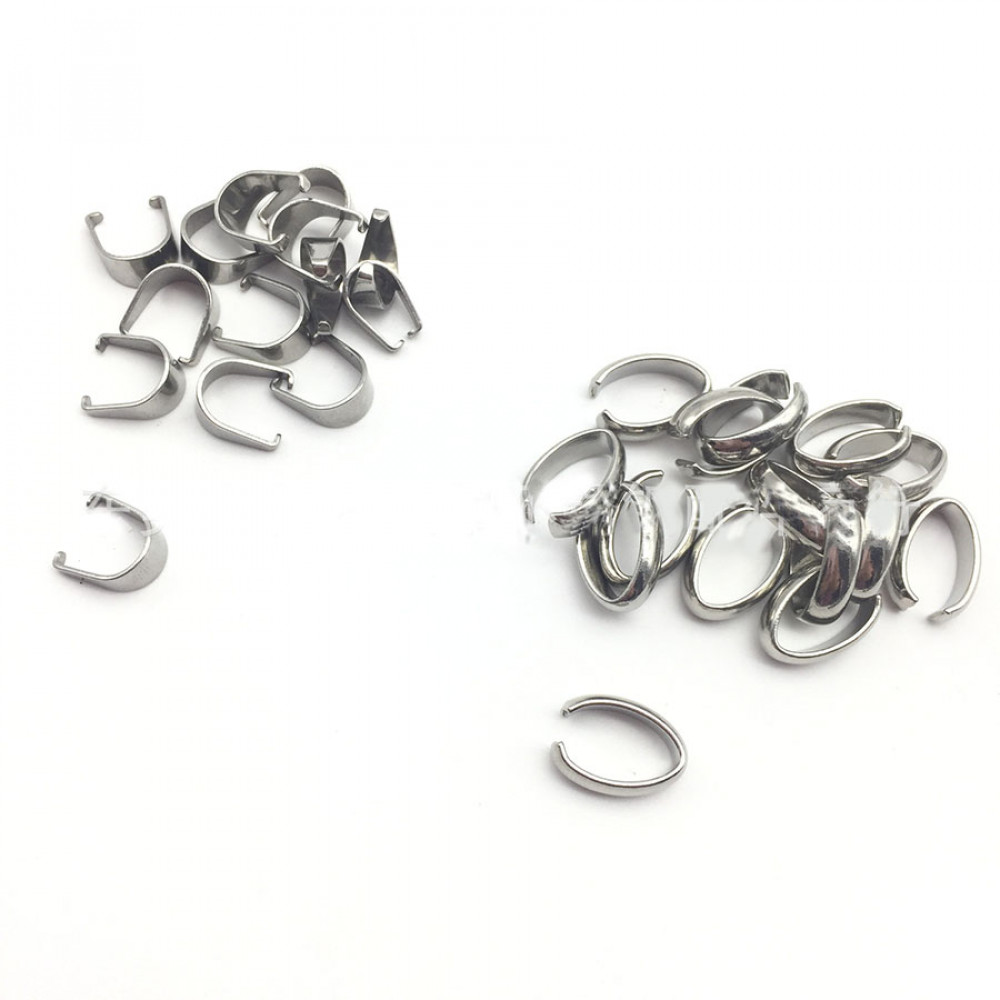 Стальная скоба (зажим, кольцо соединительное) для подвеса кулонов, подвесок, декора на кожаный шнур представленв в двух моделях: в форме овала и в форме "подковы"
