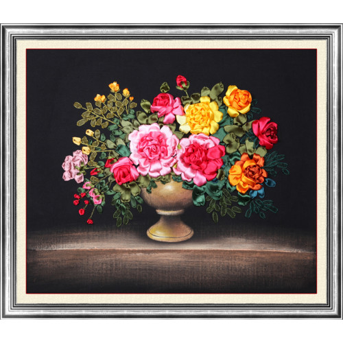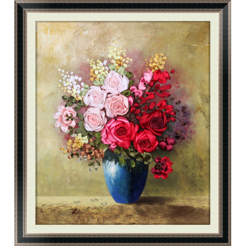 Набор для вышивки атласными лентами Розы в синей вазе Размер 50*50 смВ набор входит плотная ткань с ..