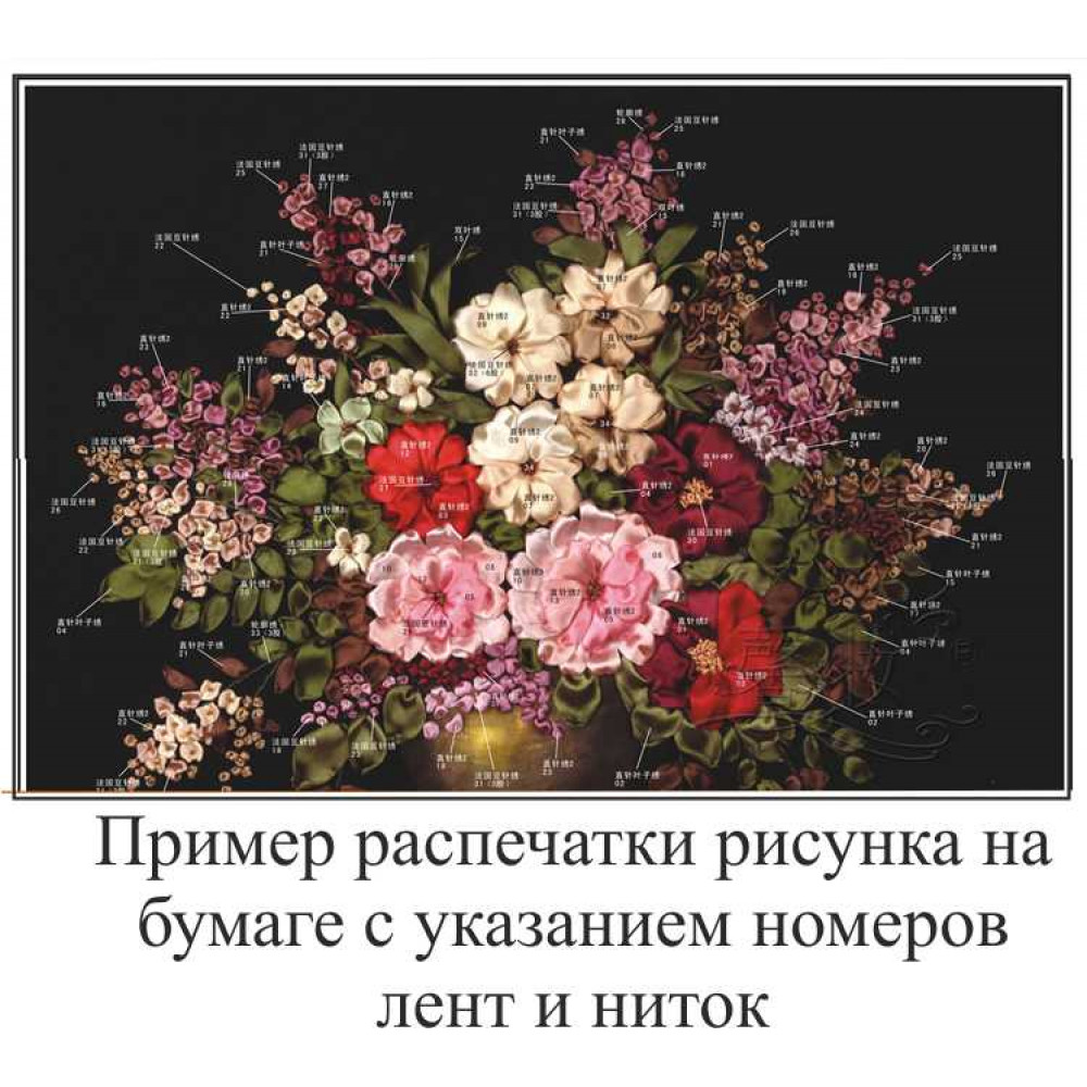 В набор входит ткань с принтом, органайзер с атласными лентами, мулине х/б, иглы, инструкция с иллюстрациями на китайском языке.