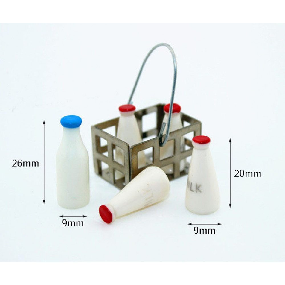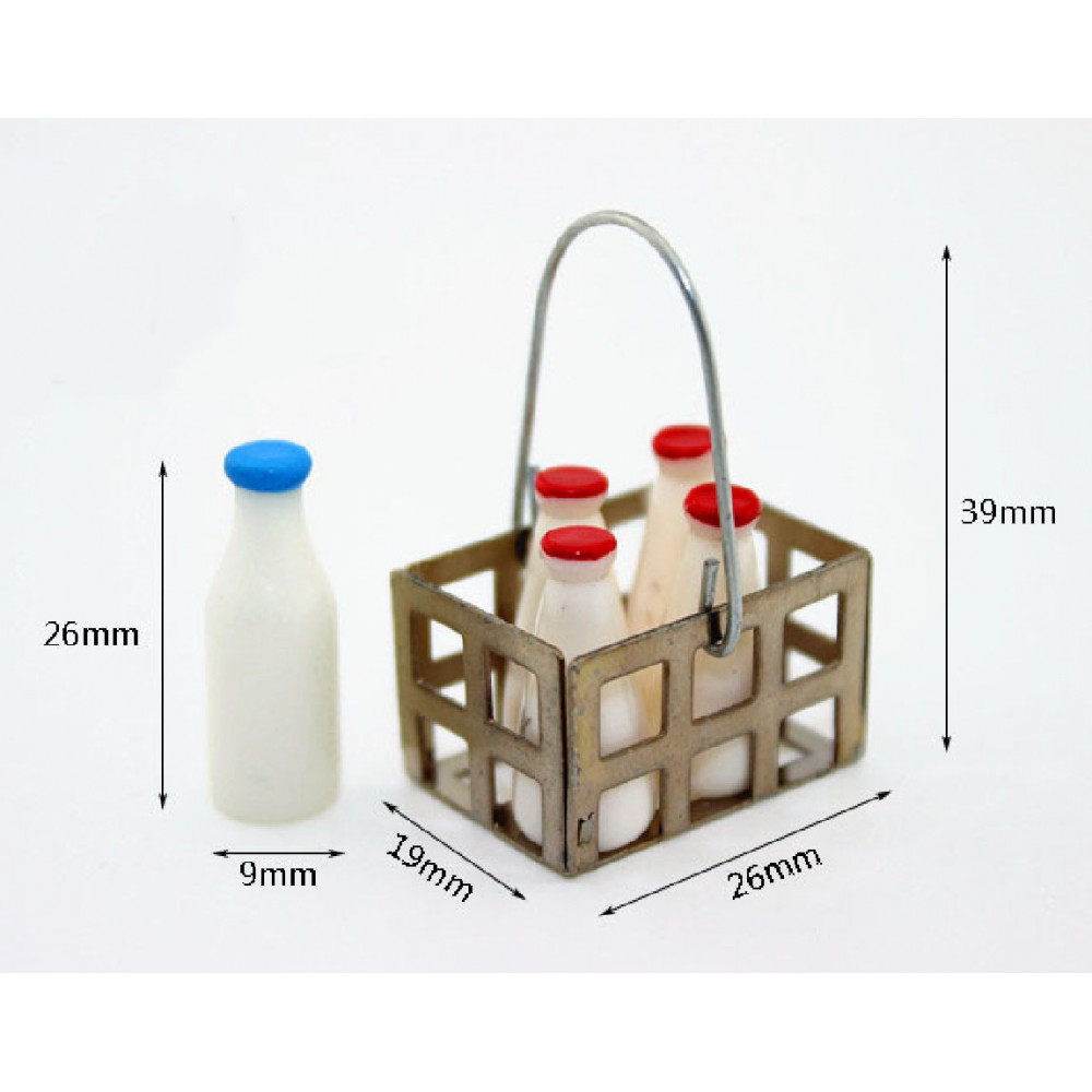 Миниатюрные бутылочки с молоком (5 шт) в корзине для кукол, оформления кукольных домиков и румбоксов масштабом 1:12 (для кукол около 12 см).