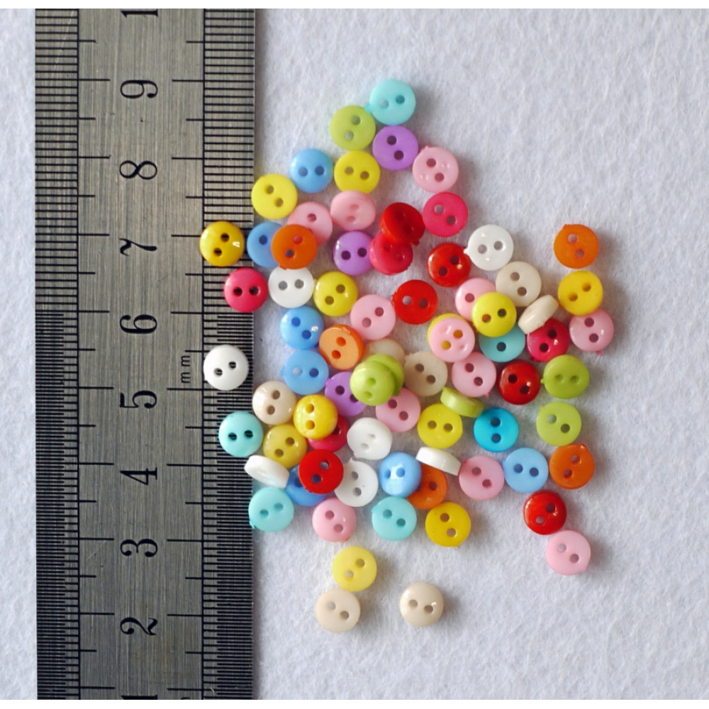 Миниатюрные пластиковые пуговки разных цветов (красный, желтый, белый, зеленый, розовый, голубой и др.). Такие мини пуговки подойдут для шитья одежды для кукол и игрушек, используются при декоре, скрапбукинге и других видах рукоделия.
