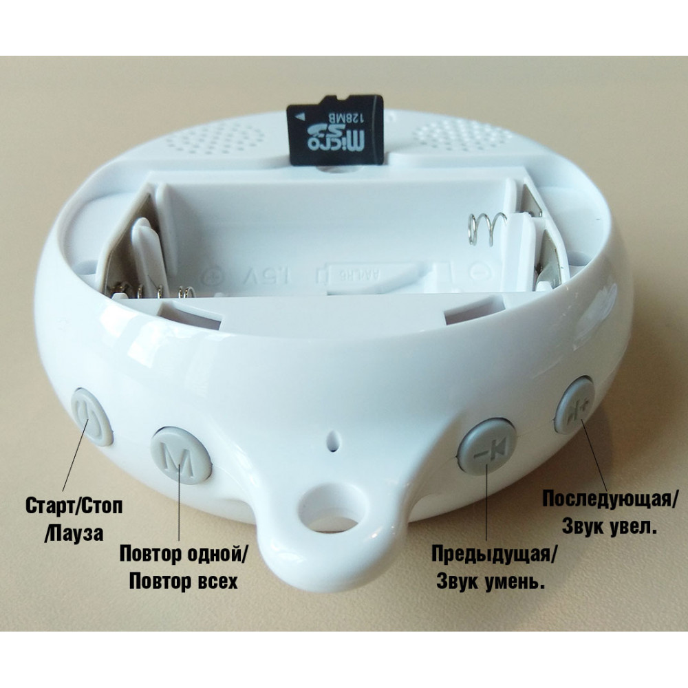 В комплект входит карта на 120 МГб с набором стандартных мелодий, которые Вы можете перезаписать при необходимости, а также USB провод. (Две пальчиковые батарейки АА, в комплект не входят).