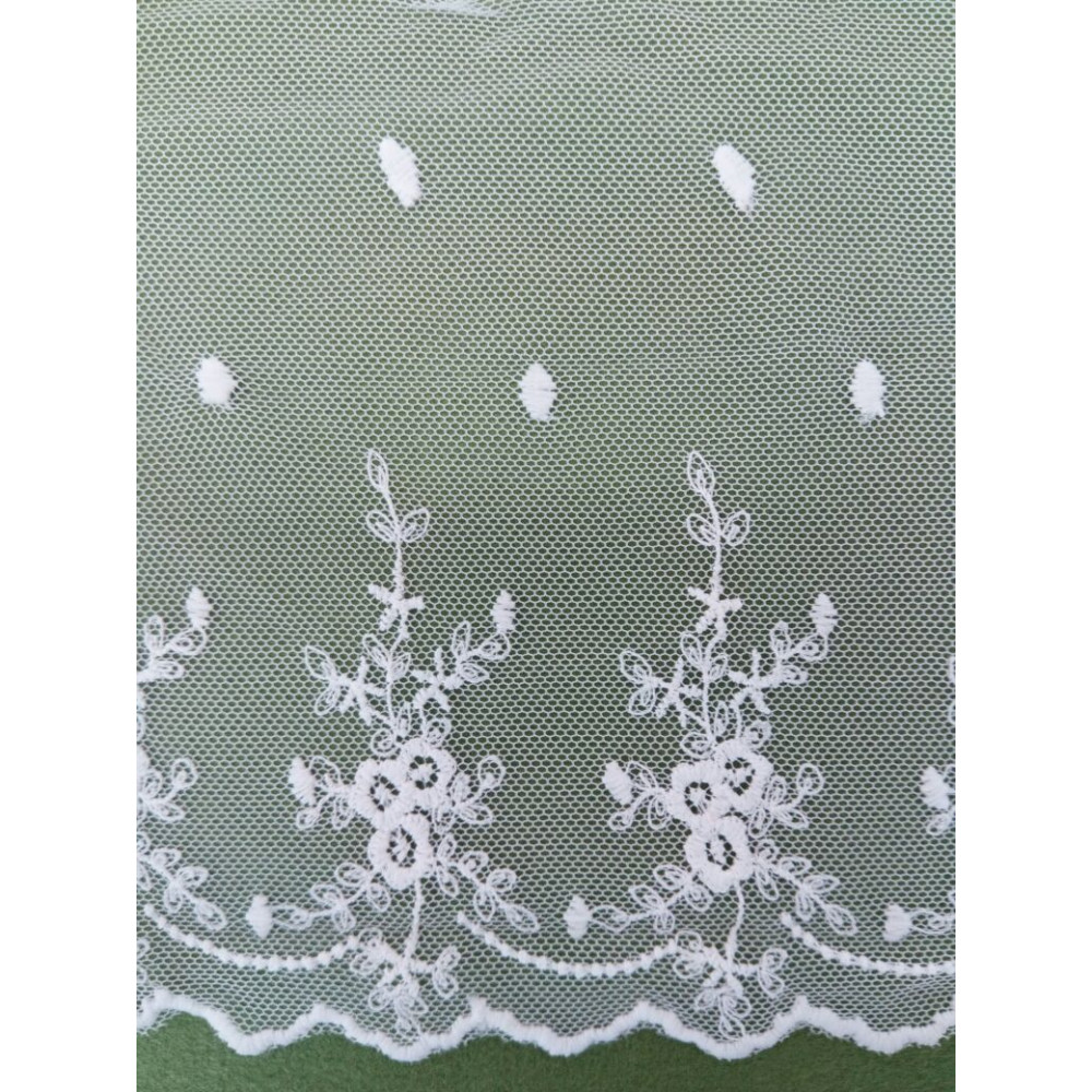 Белое шитье на сетке, изысканный нежный вышитый на мягком сетчатом материале рисунок. Декоративная кружевная тесьма подходит для самых разных видов рукоделия - при пошиве одежды, для декорирования в скрапбукинге, в куклоделии и т.д.
