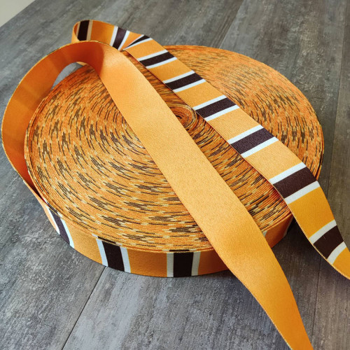 Плотная ременная лента из синтетических волокон. Цвет яркий желток, оранжевый с полосками кори..