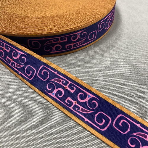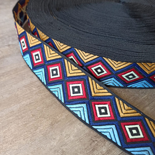 Плотная текстильная лента из синтетических волокон c вышитым орнаментом. Оригинальное цветовое сочет..