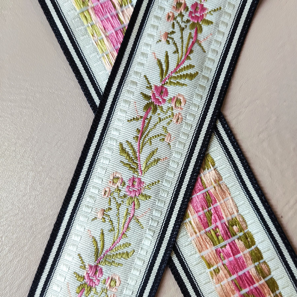 Текстильная лента (тесьма) из синтетических волокон c вышитым орнаментом нежных расцветок - милые цветочки на светлом, с черным кантом.