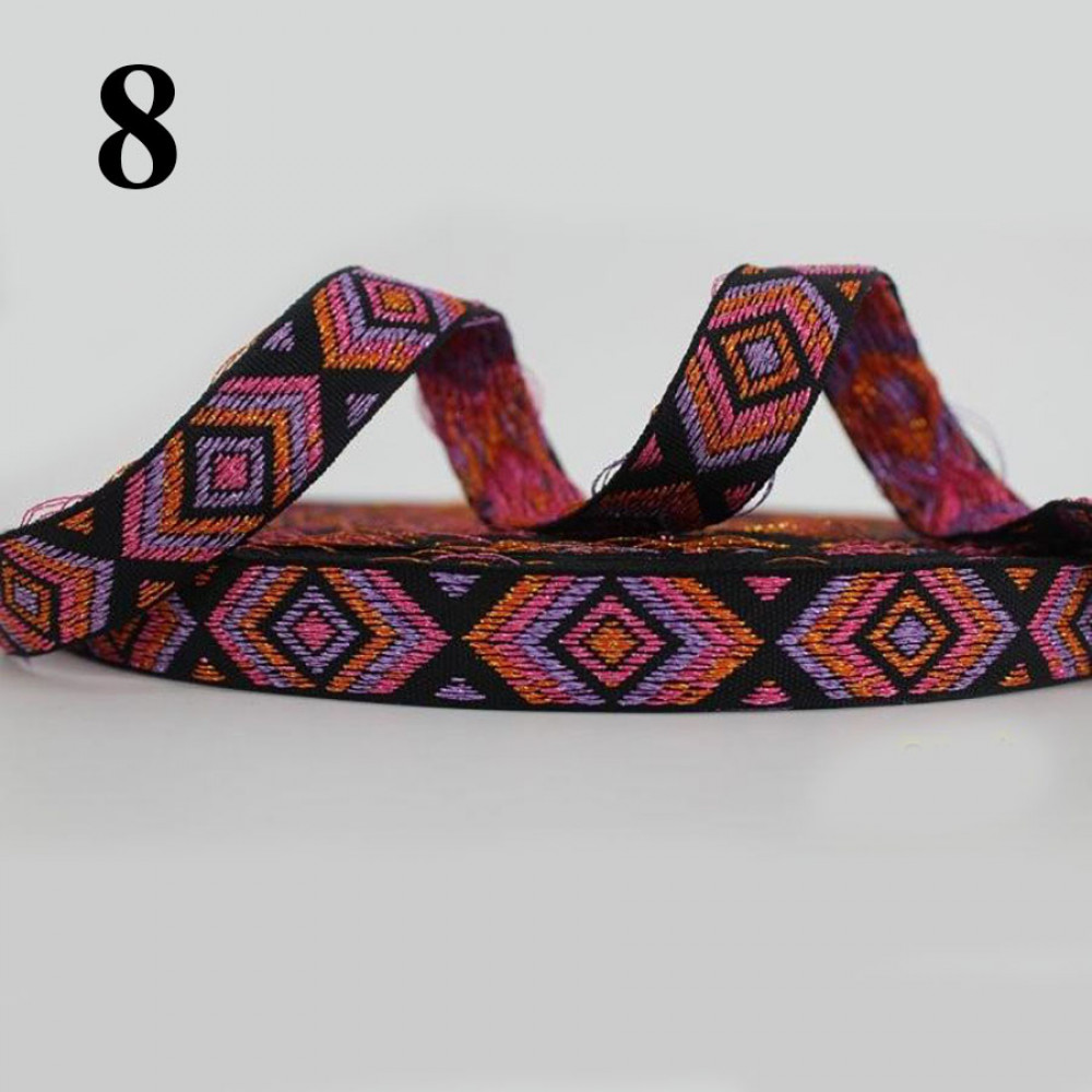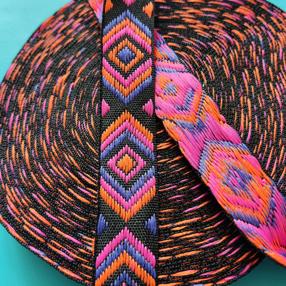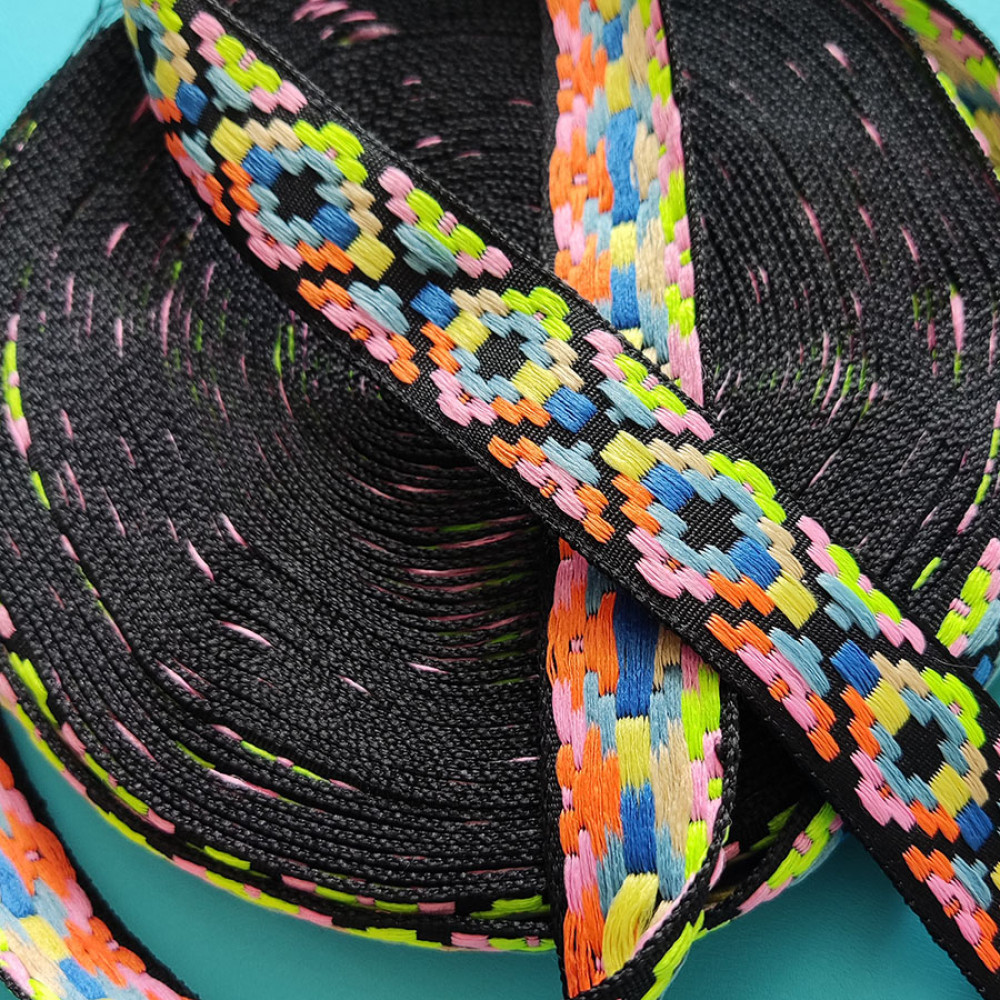 Текстильная галантерейная тесьма из синтетических волокон с вышивкой (рисунок односторонний). Яркое нарядное цветовое сочетание ленты украсит ваше изделие.