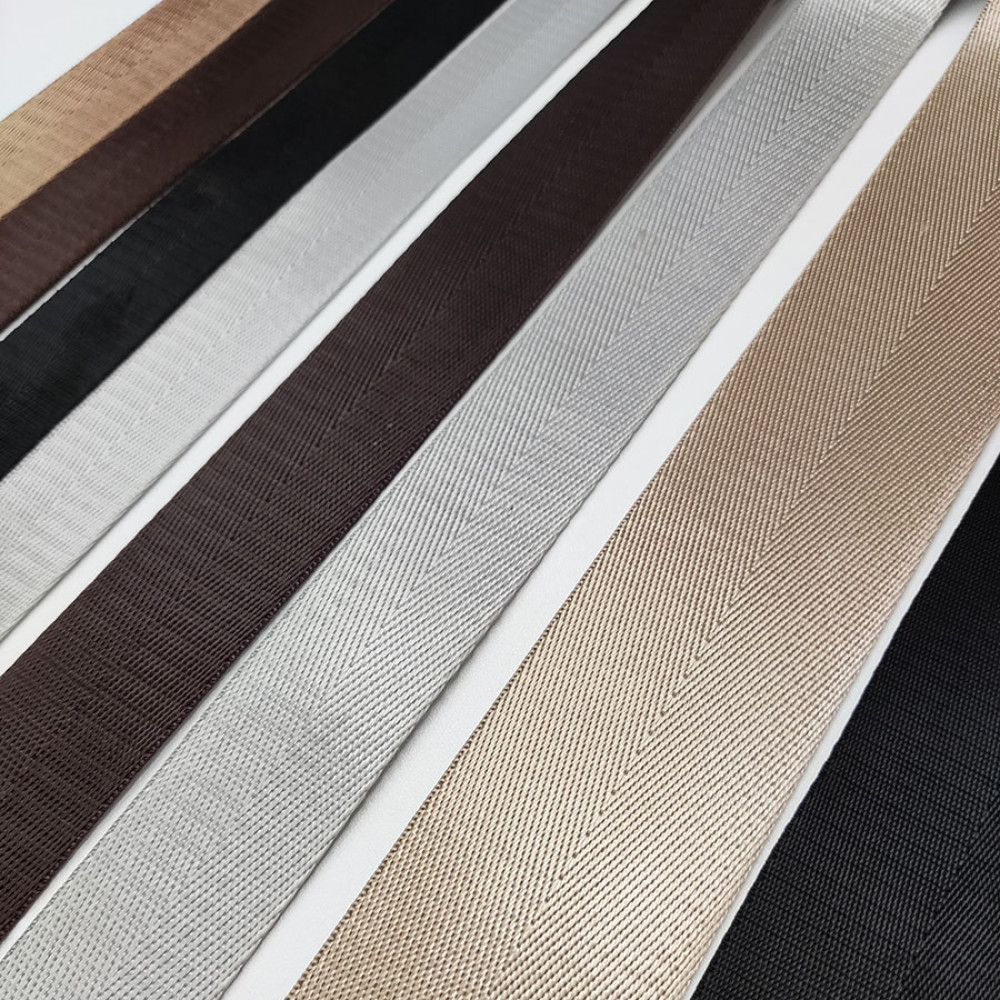 Плотная ременная лента из синтетических волокон, плетение нитей в "елочку", с атласным блеском.