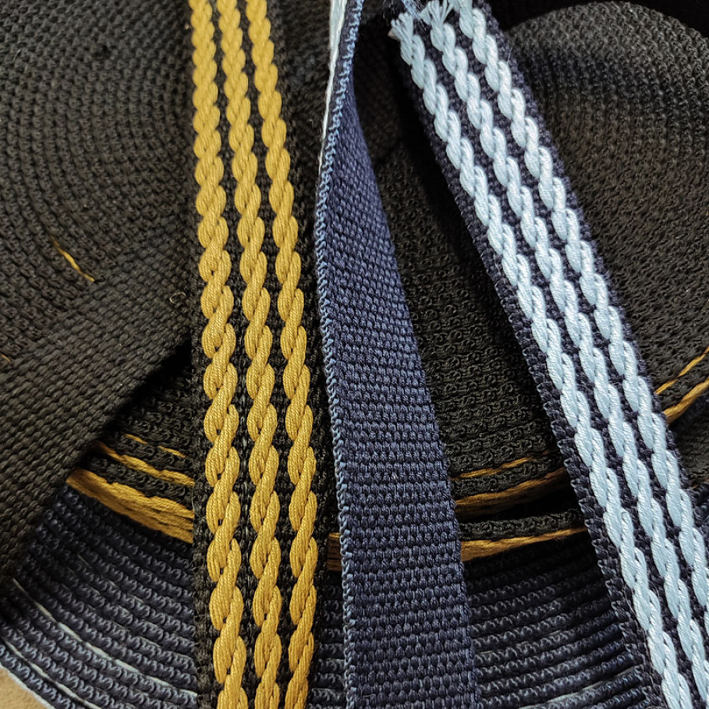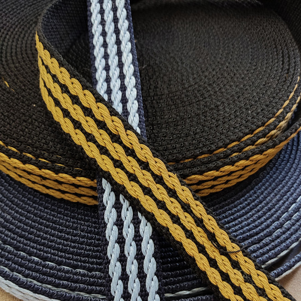 Плотная ременная лента с оригинальным рельефным плетением в виде цепи - голубая на темно-синей тесьме и горчичная на черном.