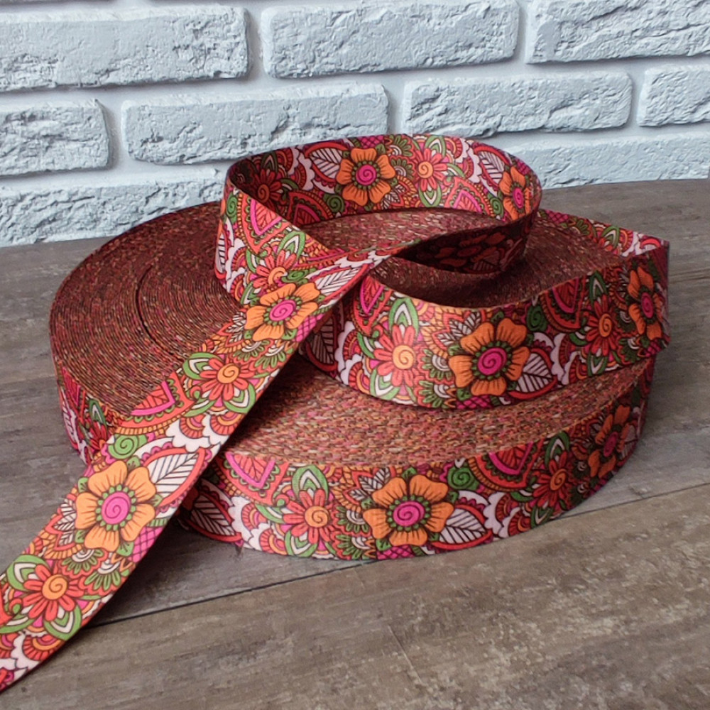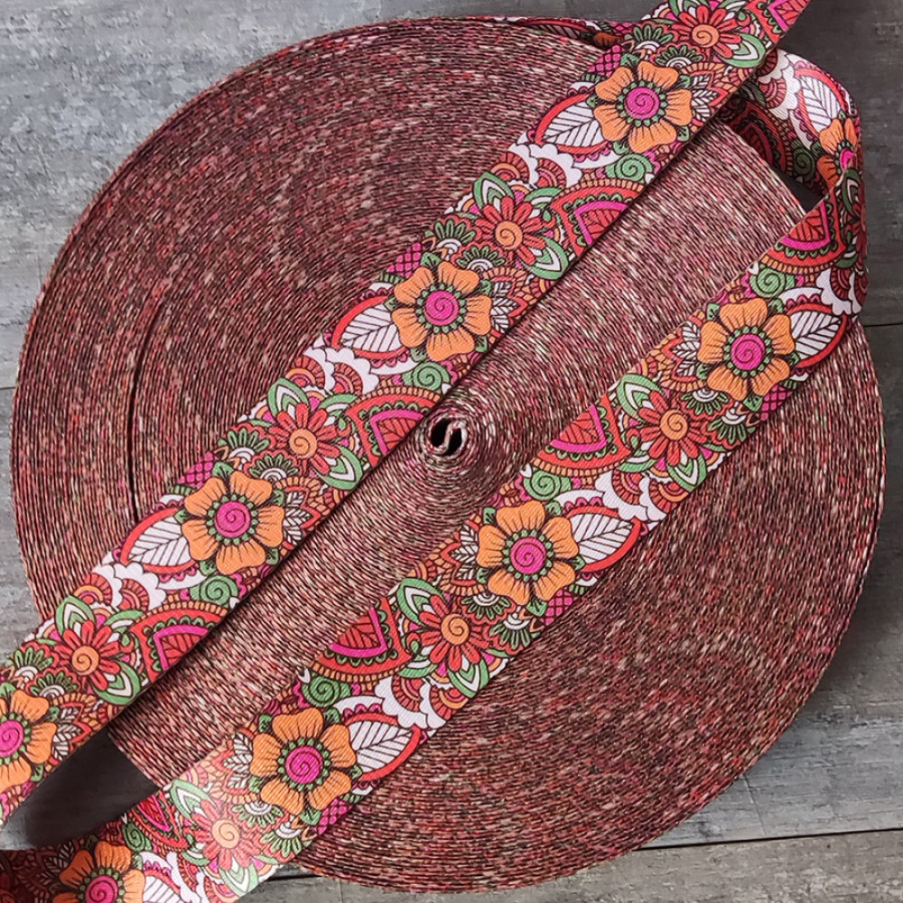 Плотная ременная лента из синтетических волокон. Пестрый насыщенный цветочный орнамент в красно-оранжевой гамме. Оригинальное цветовое сочетание ленты украсит ваше изделие.