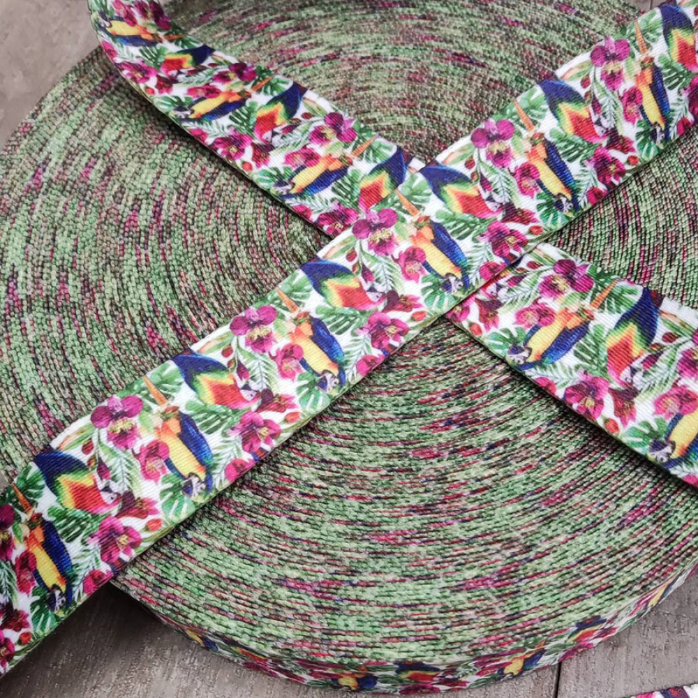Плотная ременная лента из синтетических волокон. Орнамент с попугаями, сидящими на ветках с цветами. Оригинальное цветовое сочетание ленты украсит ваше изделие.