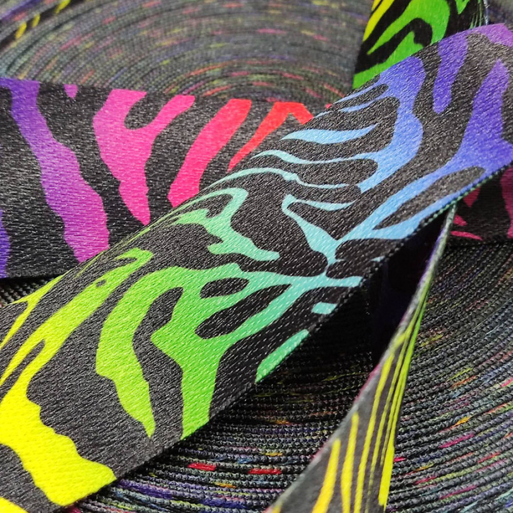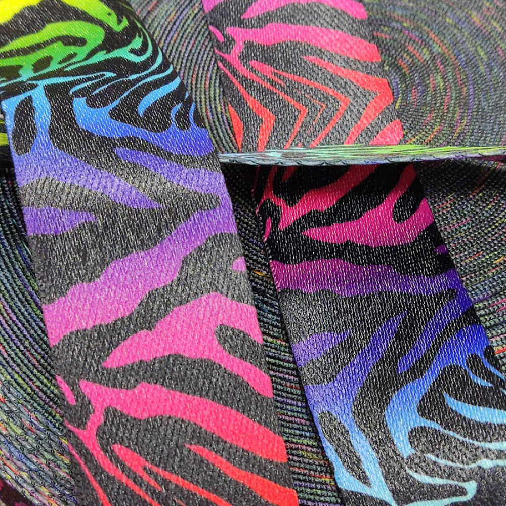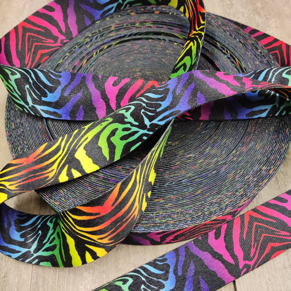 Плотная ременная лента из синтетических волокон. Орнамент под зебру на радужном фоне. Оригинальное цветовое сочетание ленты украсит ваше изделие.