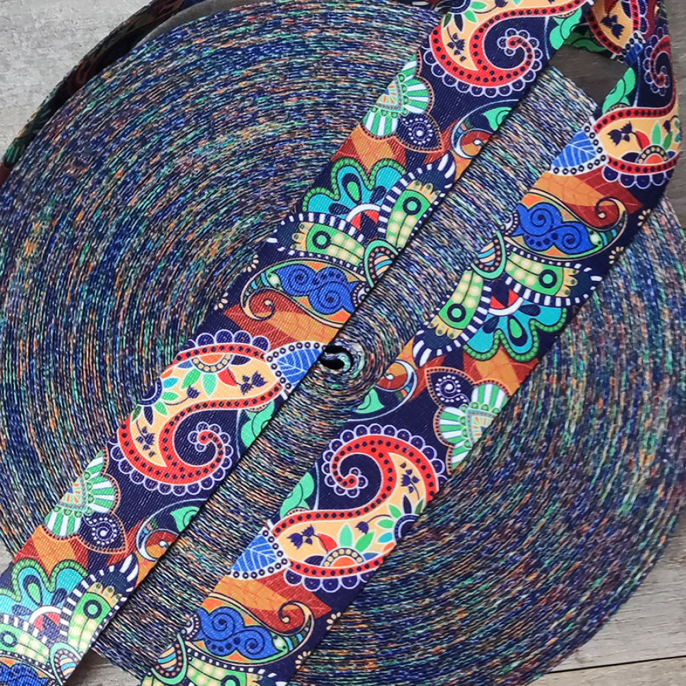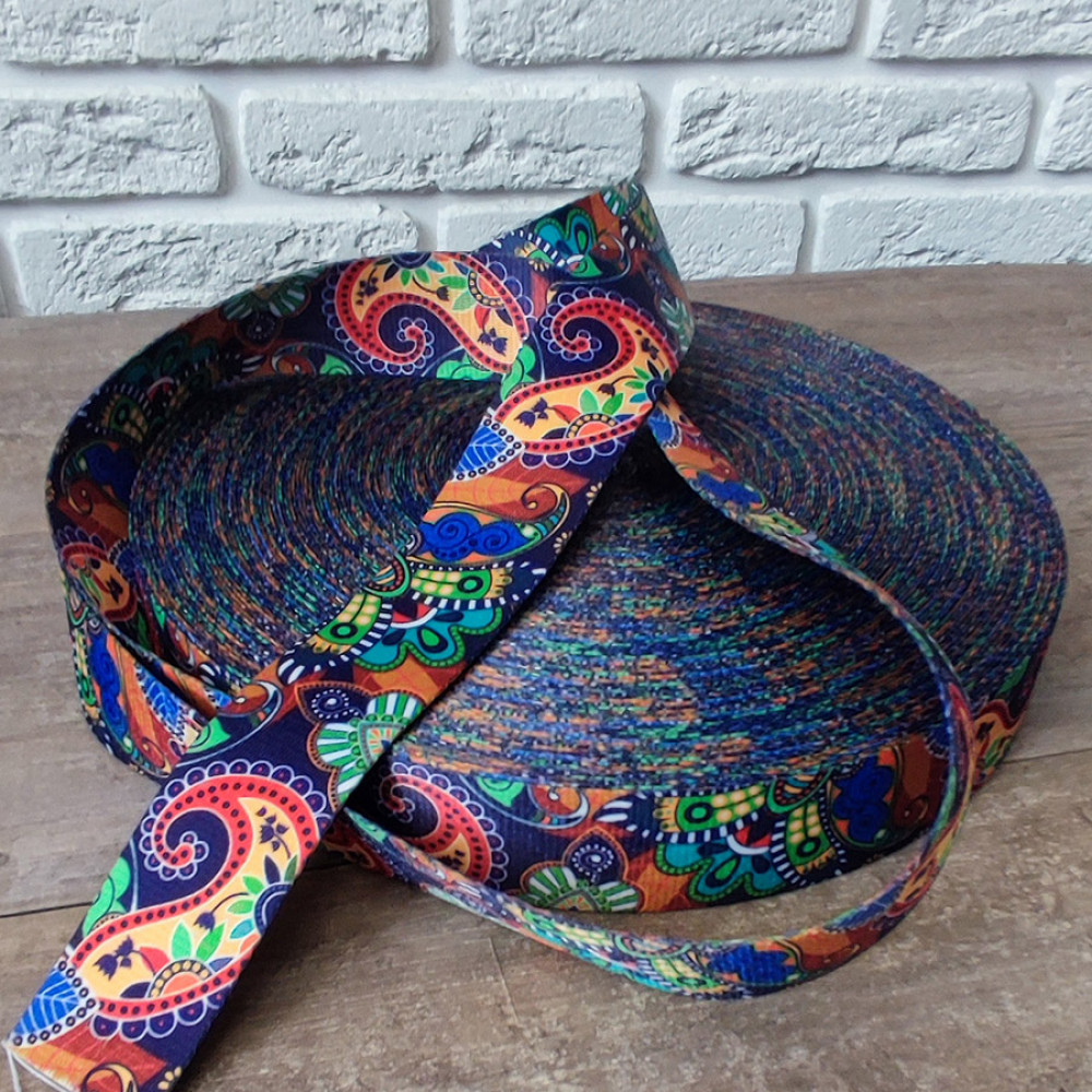 Плотная ременная лента из синтетических волокон. Пестрый пейсли орнамент на темно-синем фоне. Оригинальное цветовое сочетание ленты украсит ваше изделие.