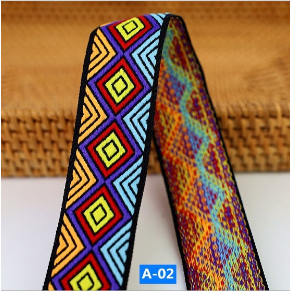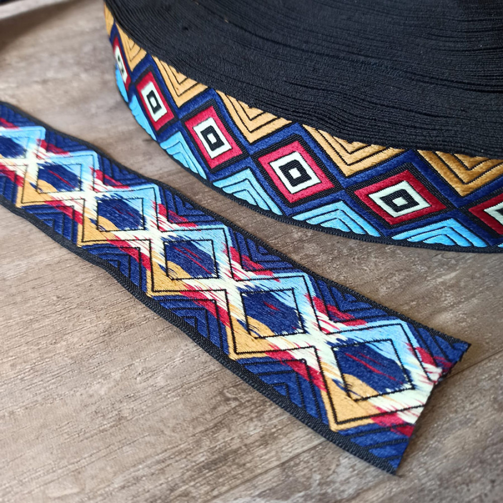 Плотная текстильная лента из синтетических волокон c вышитым орнаментом. Оригинальное цветовое сочетание в этническом стиле ленты украсит ваше изделие.