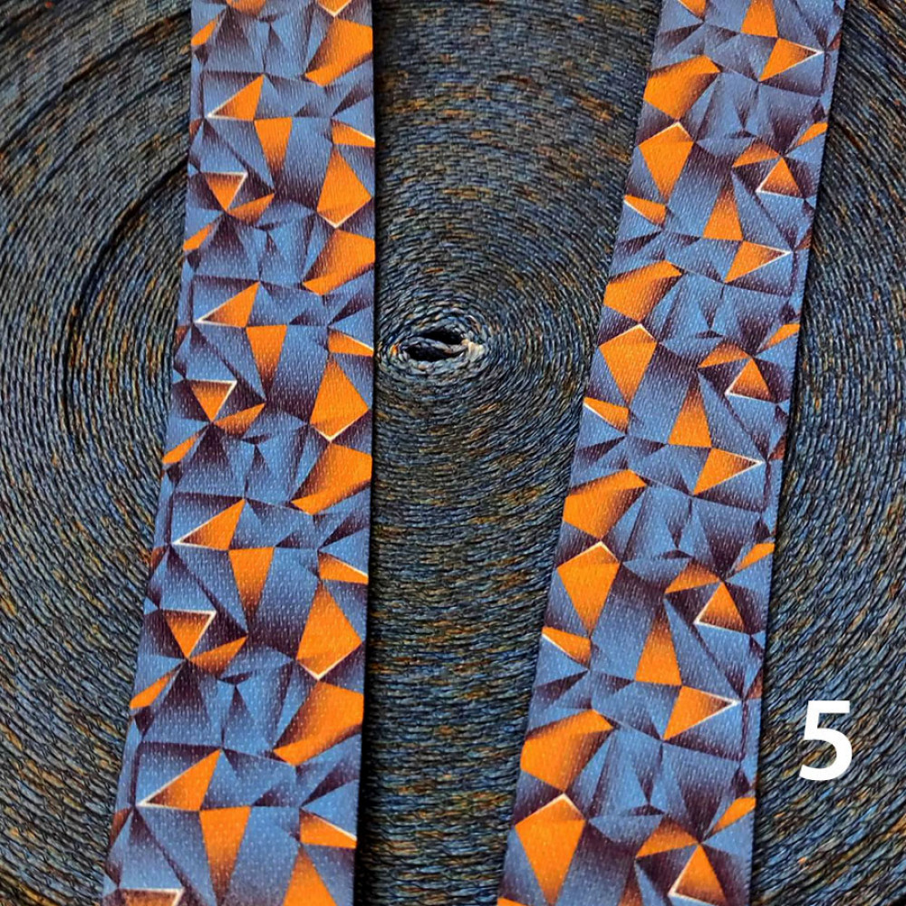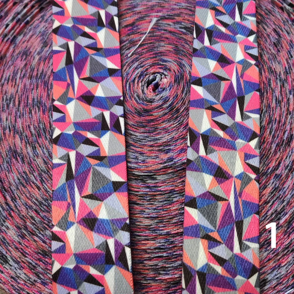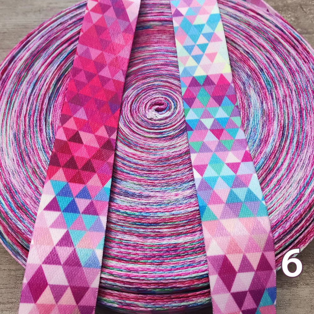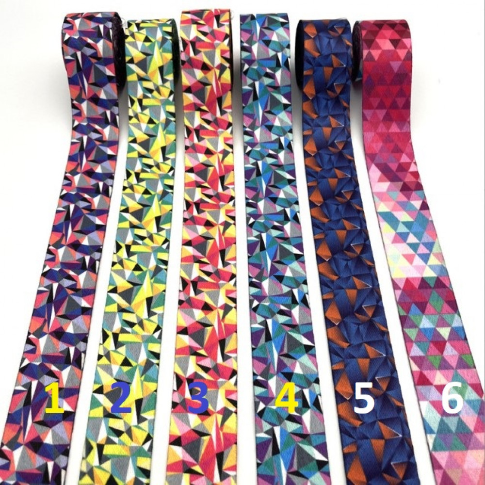 Стропа (ременная лента) средней плотности из синтетических волокон - с геометрическим орнаментом, множеством разноцветных ромбов и треугольников. Оригинальное цветовое сочетание принта текстильной стропы с ярким рисунком украсит ваше изделие.