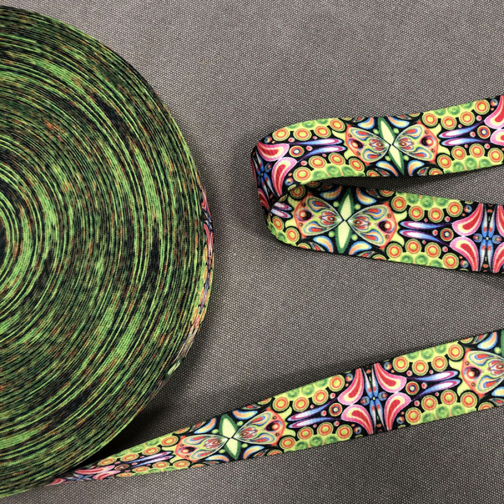 Стропа (ременная лента) плотная из синтетических волокон - с ярким фрактальным орнаментом с преобладанием зеленых оттенков в разнообразной цветовой гамме подойдет для различных галантерейных изделий. Лента двусторонняя - на правой и левой стороне рисунок как лицевой