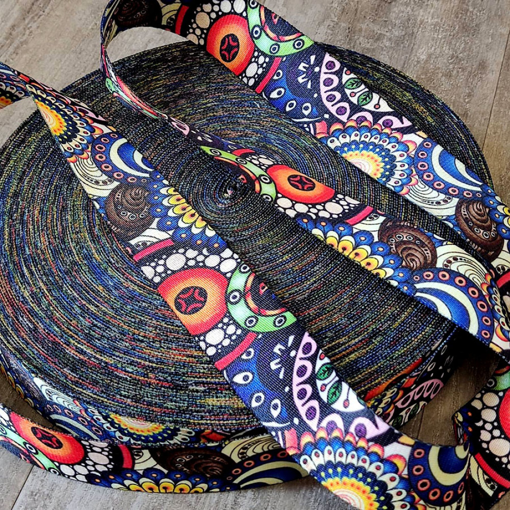 Стропа (ременная лента) плотная из синтетических волокон - с геометрическим орнаментом в виде разноцветных окружностей. Лента двусторонняя - на правой и левой стороне рисунок как лицевой
