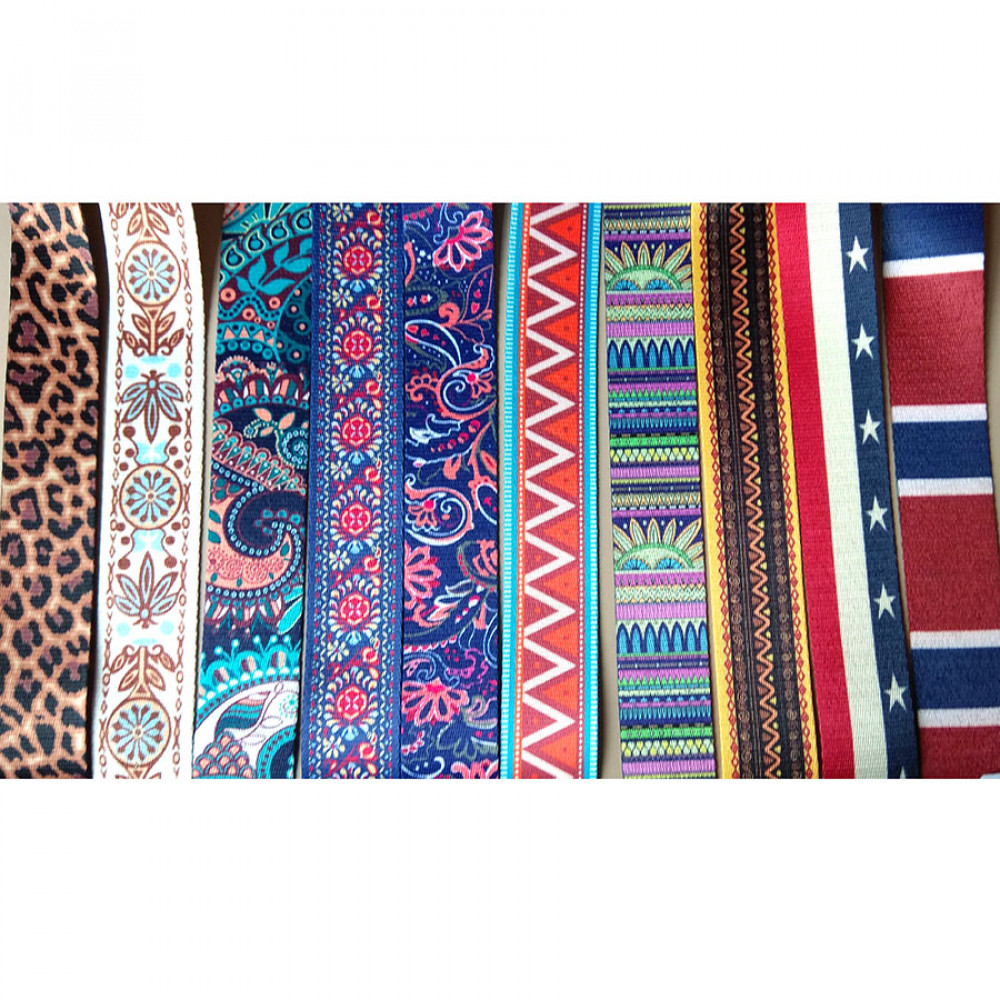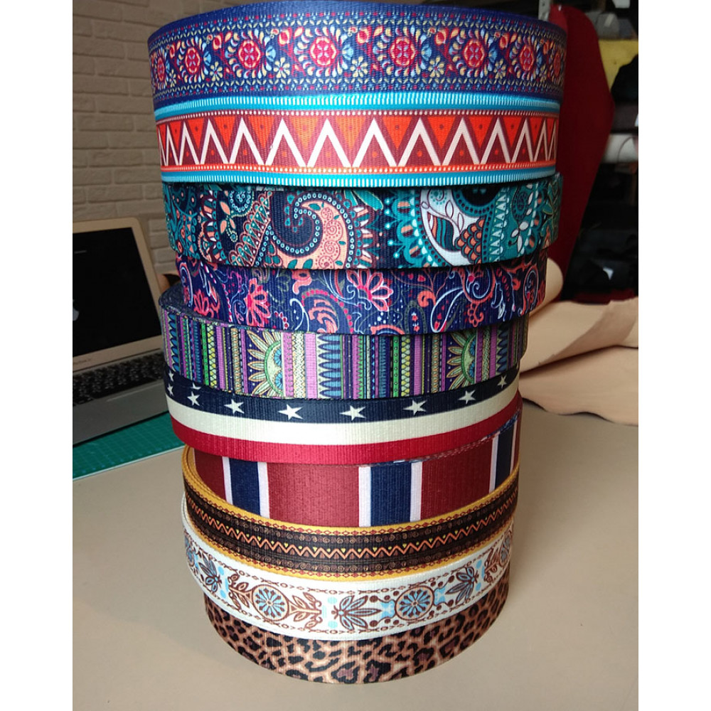Стропа (ременная лента) средней плотности из синтетических волокон. Оригинальное цветовое сочетание текстильной стропы с ярким принтом украсит ваше изделие.