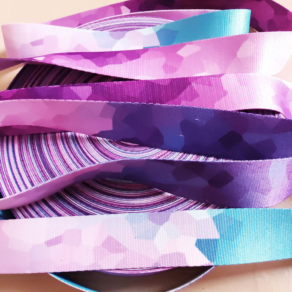 Стропа (ременная лента) плотная из синтетических волокон - с нежной розово-сиреневой гамме с сине-голубыми оттенками. Такая расцветка текстильной ленты (тесьмы) идеально подойдет к весенне-летним женским и детским сумочкам.