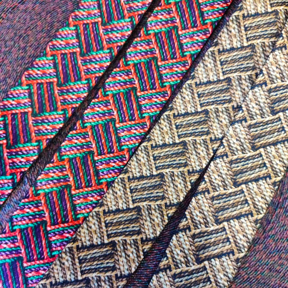 Стропа (ременная лента) средней плотности из синтетических волокон. Орнамент в виде переплетенных шнуров натуральной или пестрой расцветки. Оригинальное цветовое сочетание текстильной стропы с ярким принтом украсит ваше изделие.