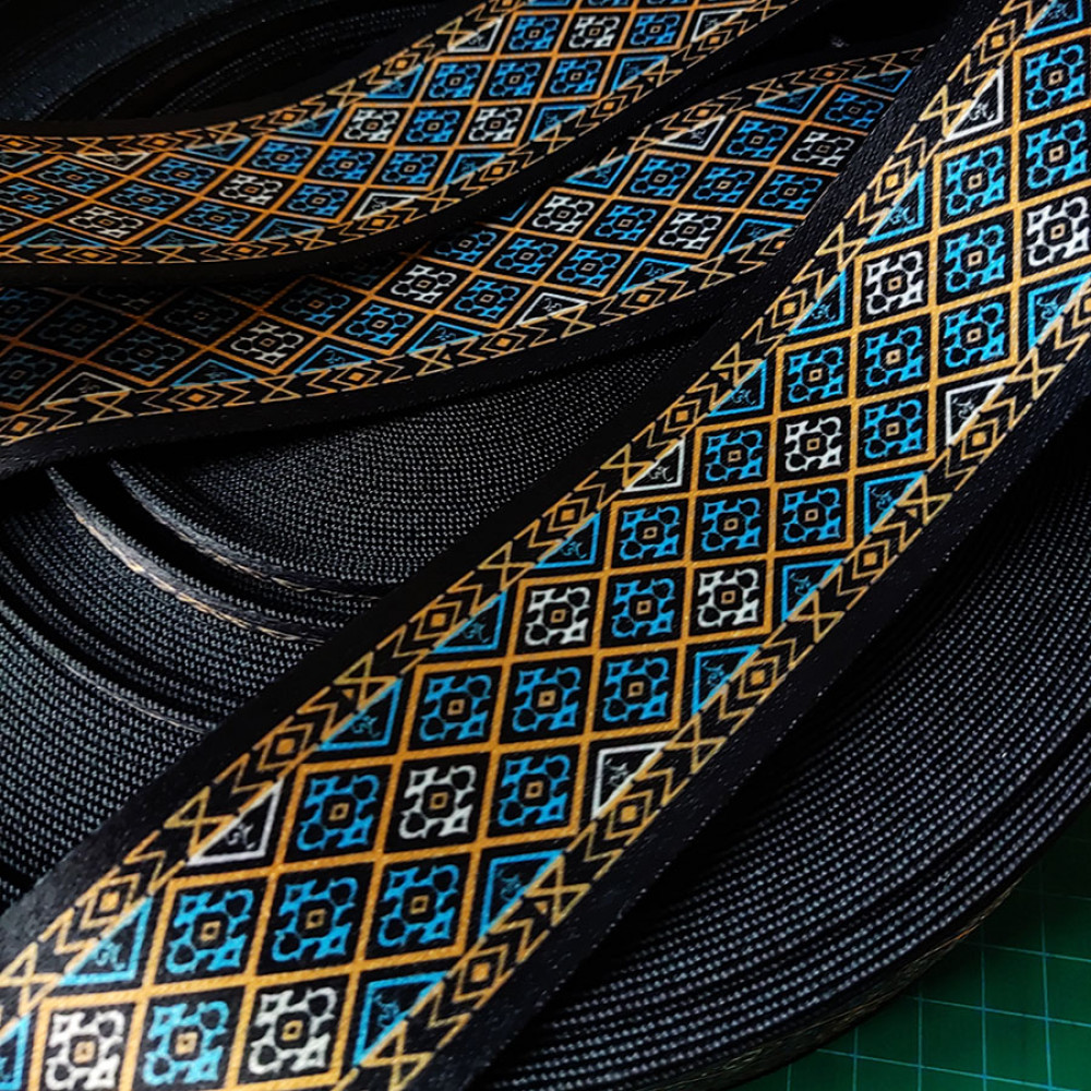 Стропа (ременная лента) плотная из синтетических волокон - с выдержанным геометрическим орнаментом в виде синих и белых ромбов в золотистой (желтой) сетке.