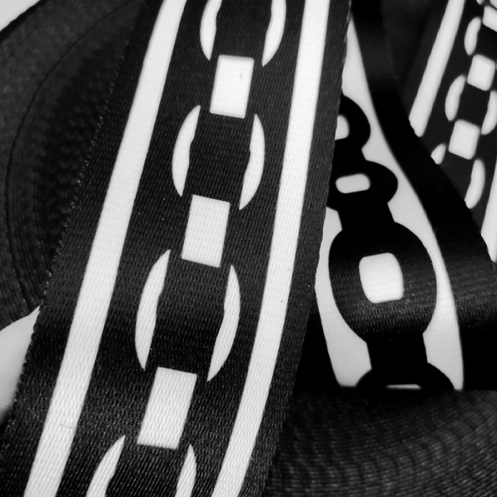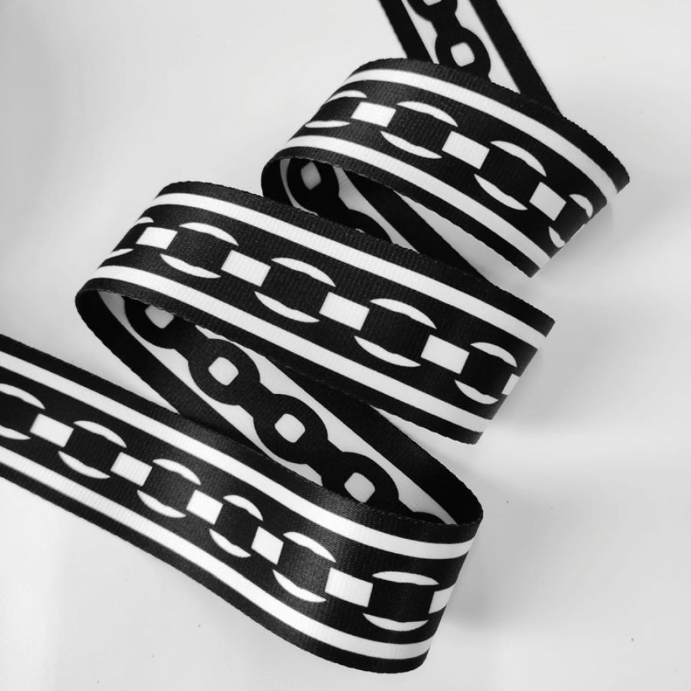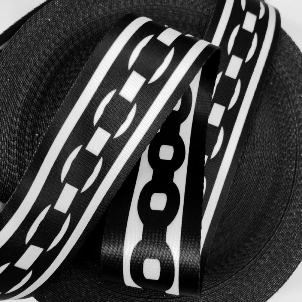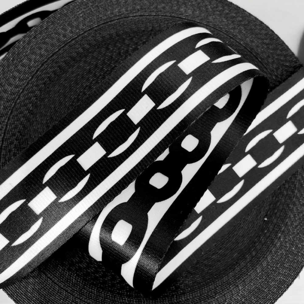Широкая плотная стропа текстильная (ременная лента) из синтетических волокон. На ременной тесьме принт в виде цепи, классическая черно-белая гамма подойдет как к мужской, так и к женсокй галантереи