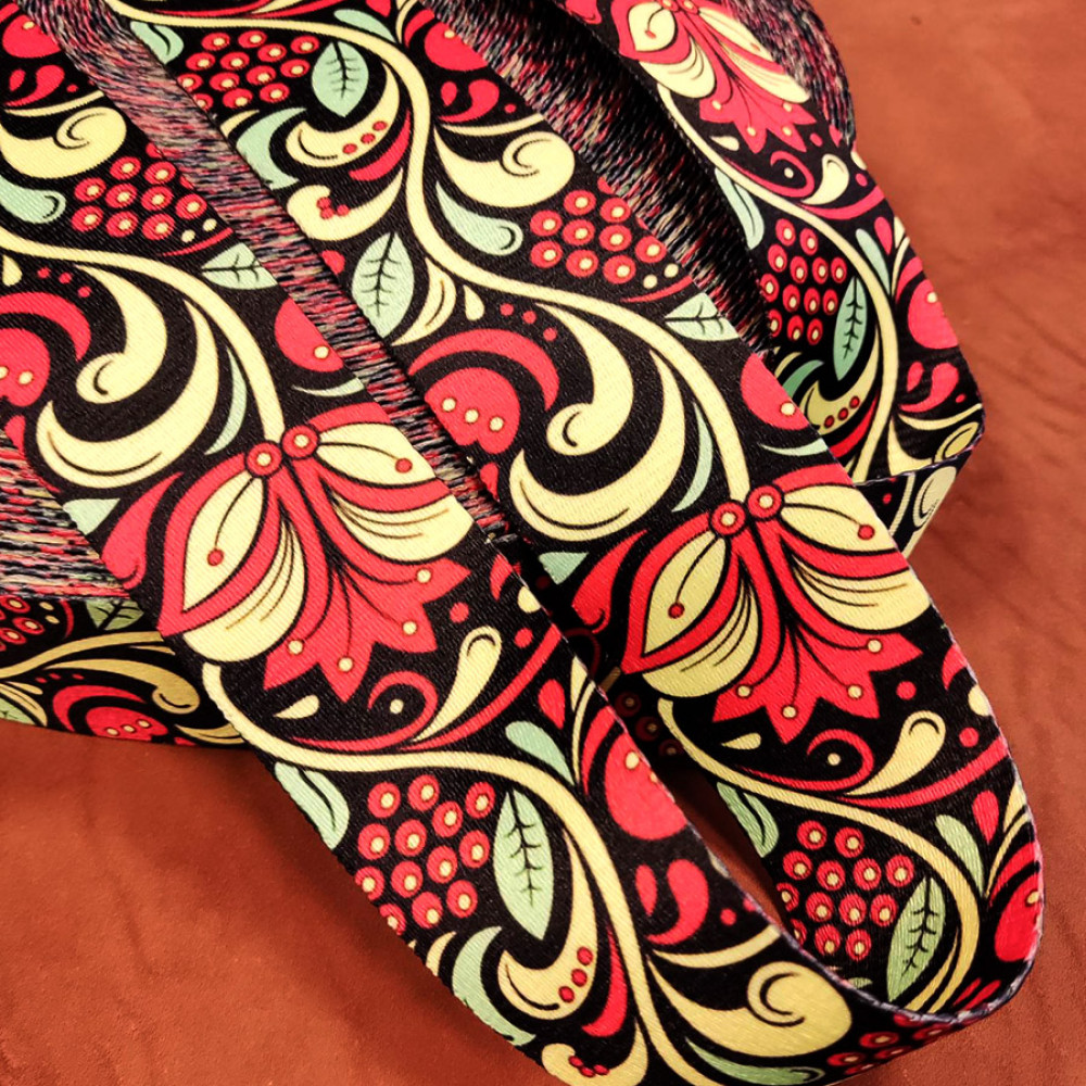 Широкая плотная стропа текстильная (ременная лента) из синтетических волокон. На ременной тесьме яркий нарядный принт с традиционным русским рисунком под хохлому