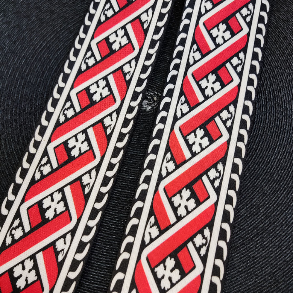 Стропа (ременная лента) плотная из синтетических волокон - с выдержанным геометрическим орнаментом в виде переплетения красных и белых линий на черном фоне с белыми краями.