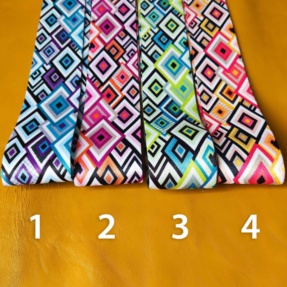 Стропа (ременная лента) плотная из синтетических волокон - с выдержанным геометрическим орнаментом в виде ярких ромбов на черном фоне с красными полями.