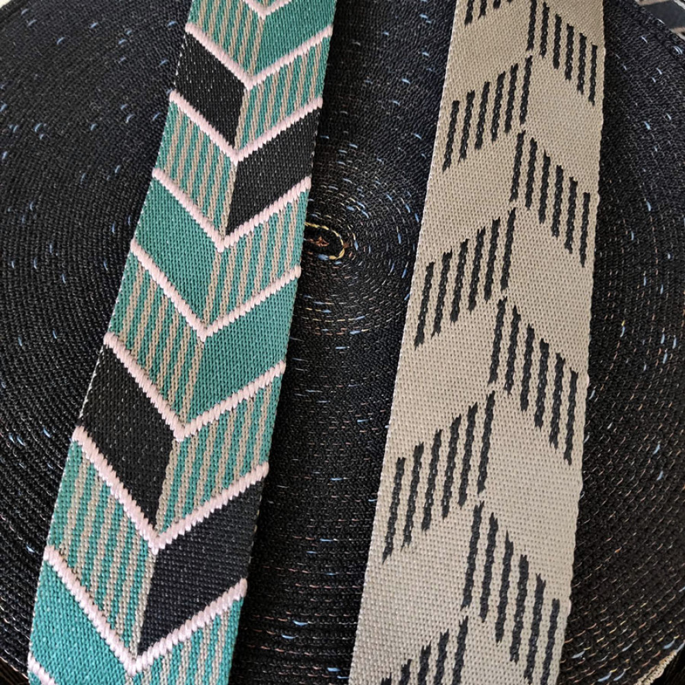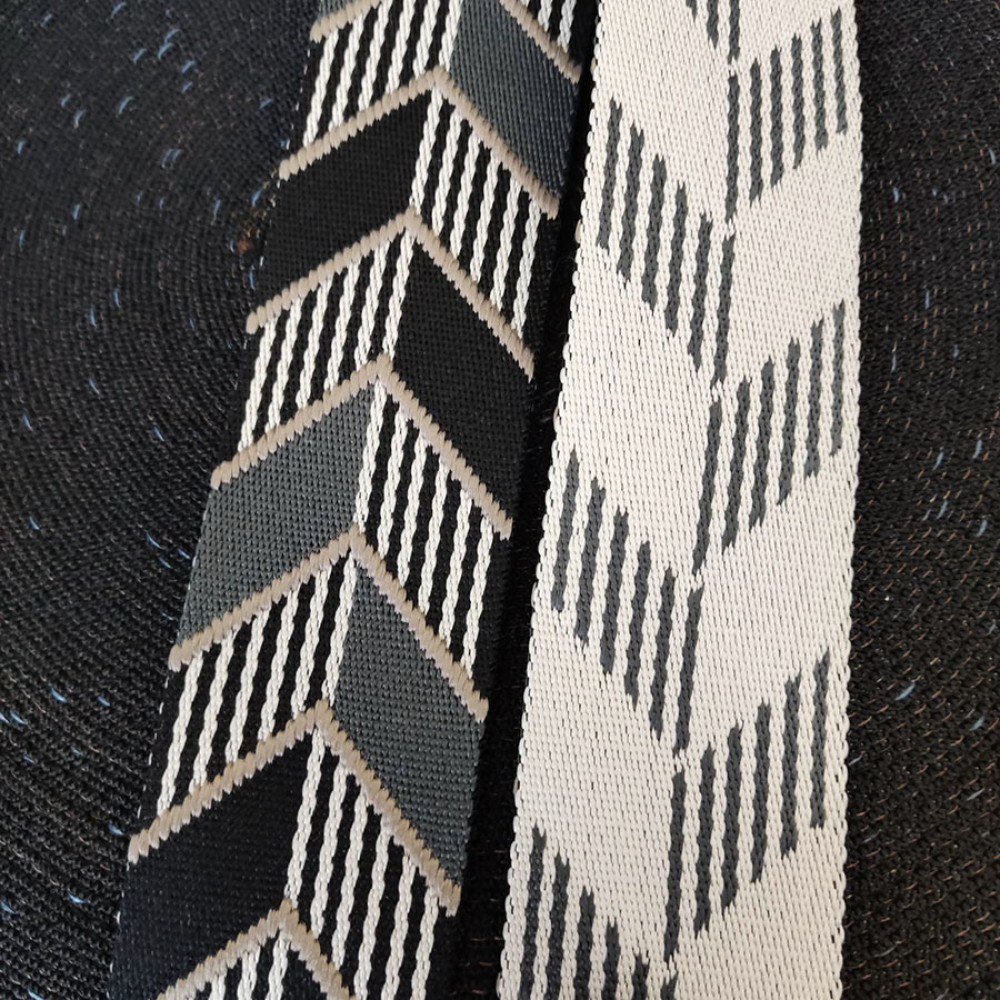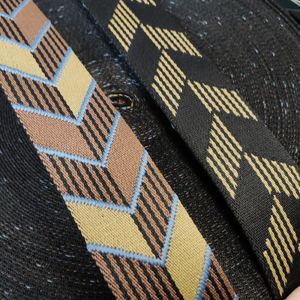 Стропа (ременная /ранцевая лента) из синтетических волокон - плотная, с жаккардовым переплетением в виде протектора автомобильной шины в различных цветовых гаммах. Данная ременная тесьма на обратной стороне имеет другой рисунок