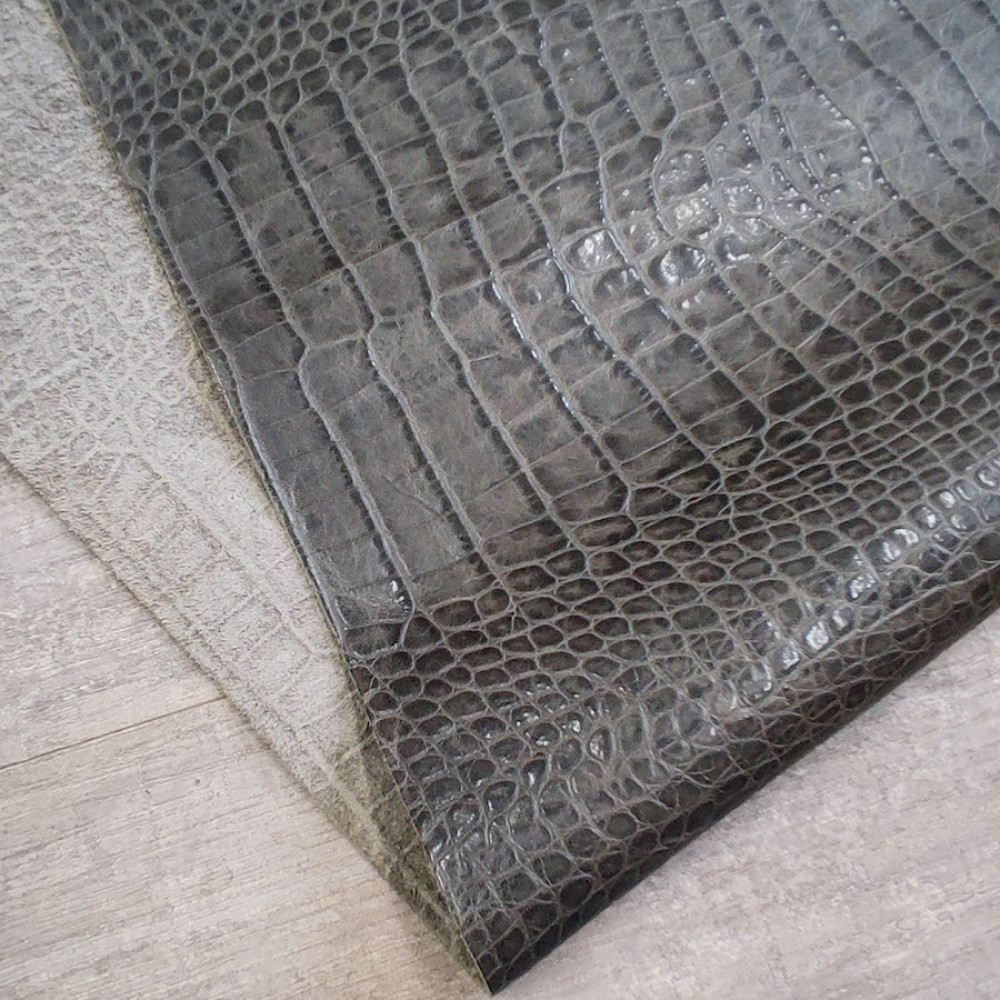 Кожа КРС хромового дубления с тиснением плитой под крокодила. Кожа тонкая, плотная. Лицо гладкое, глянцевое, чистый цвет и узор.