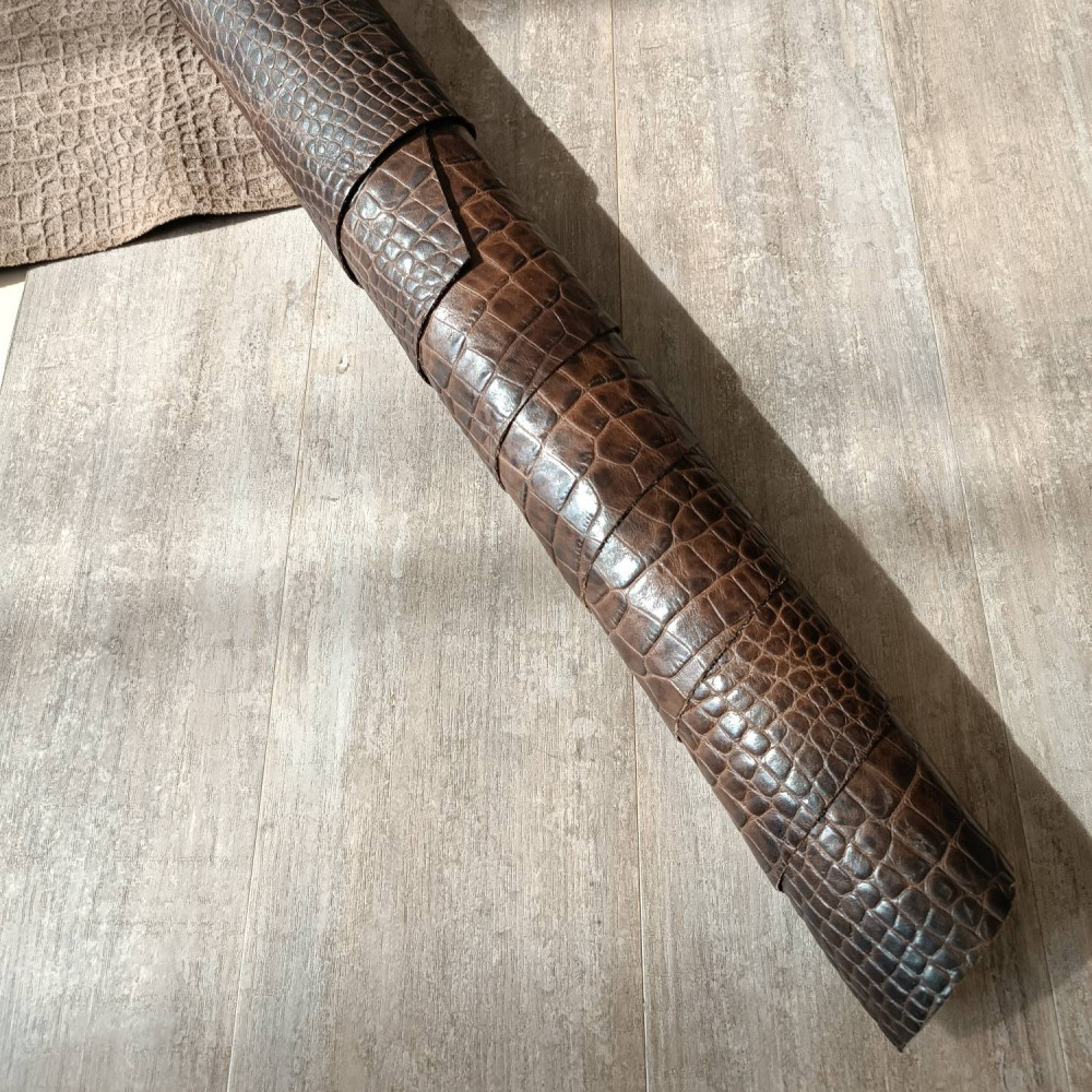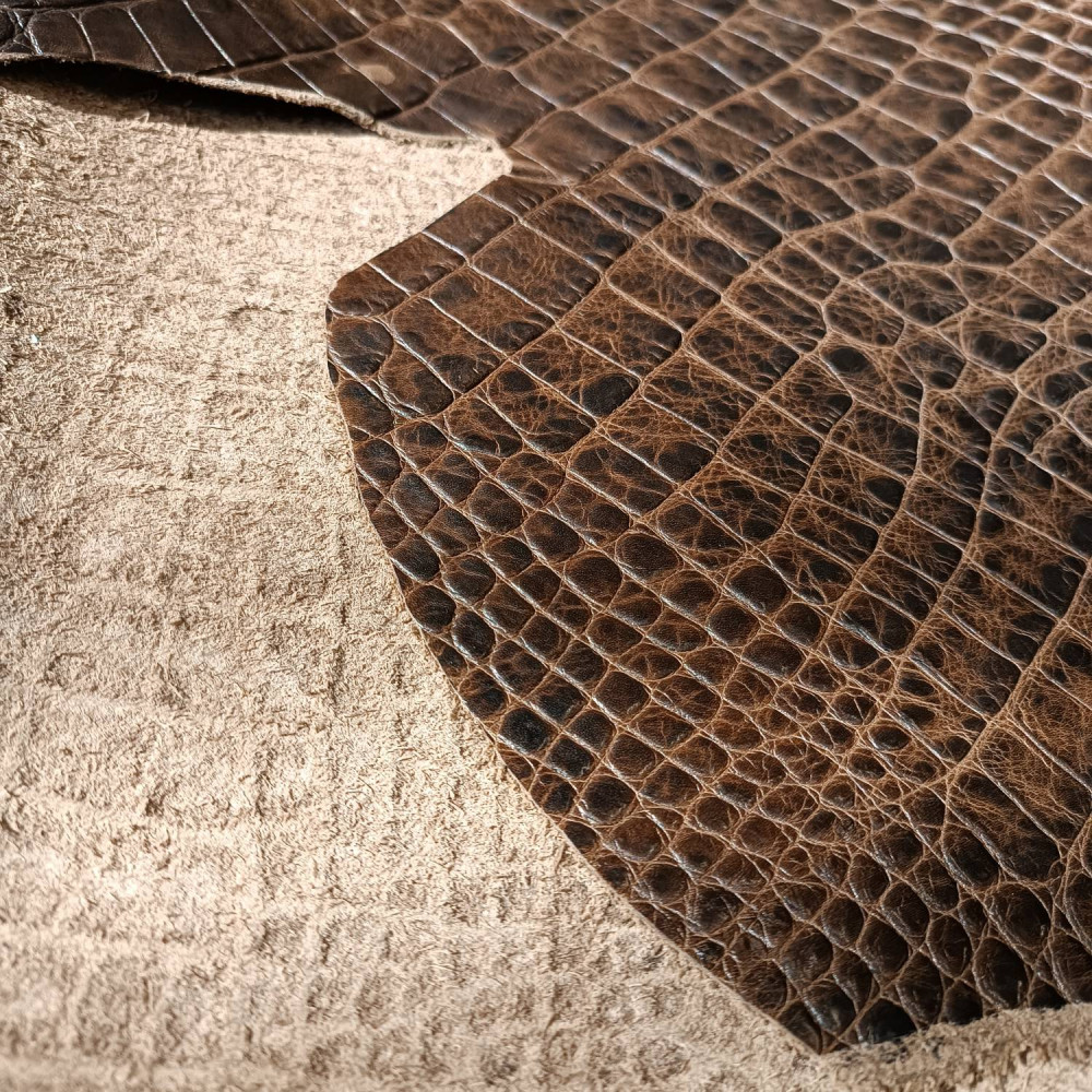 Кожа КРС хромового дубления с тиснением плитой под каймана. Кожа тонкая, плотная. Лицо гладкое, оригинальный цвет и узор.