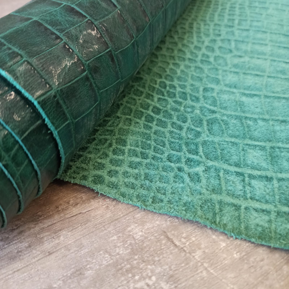 Кожа КРС хромового дубления с тиснением плитой под каймана. Кожа тонкая, плотная. Лицо гладкое, оригинальный цвет и узор.