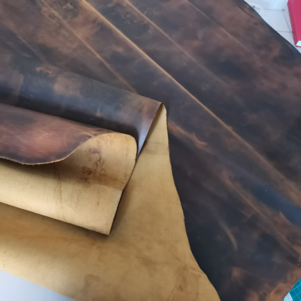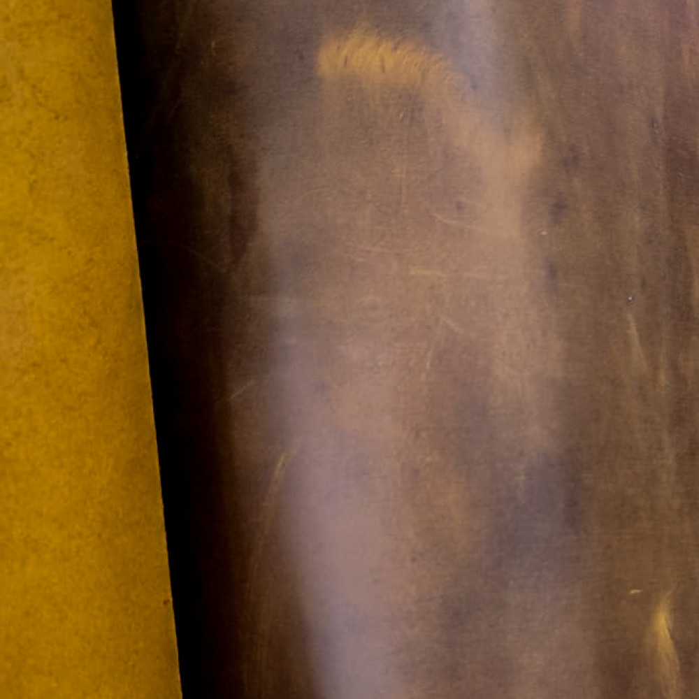 Кожа плотная, эластичная, прочная, лицо приятное на ощупь. Кожа крейзи хорс отлично подойдёт для широкого круга изделий, ручного и машинного шитья.