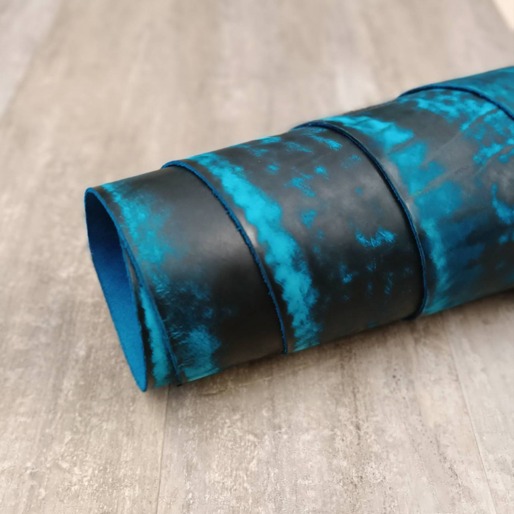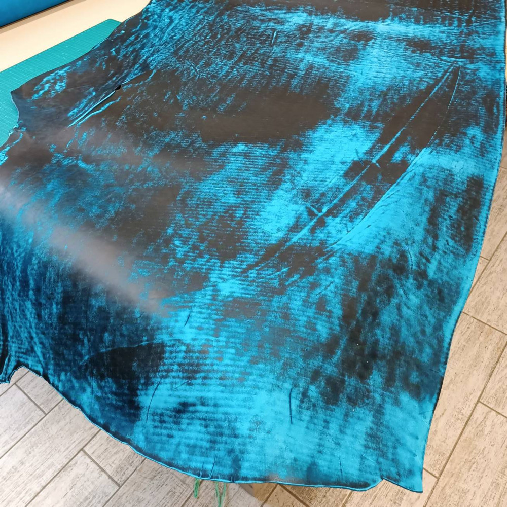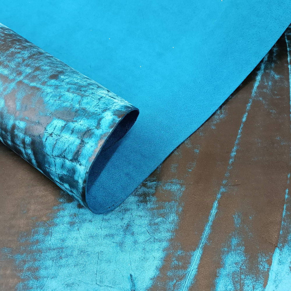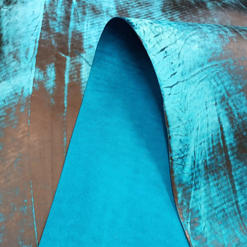 Кожа за счет особенностей обработки лицевой поверхности имеет оригинальный неповторимый узор. Сквозь Черный лицевой окрас поглядывает бирюзовая сквозная тонировка.