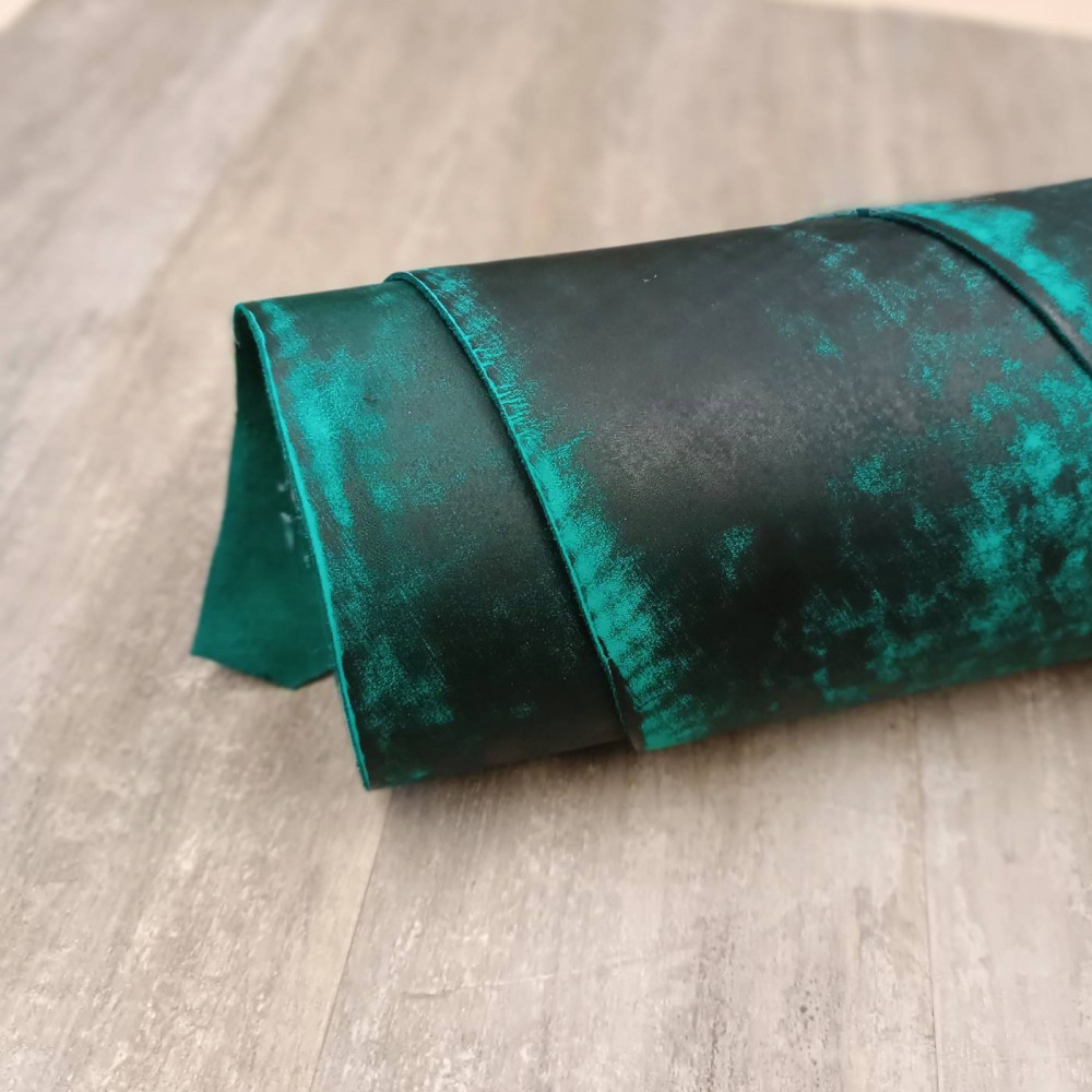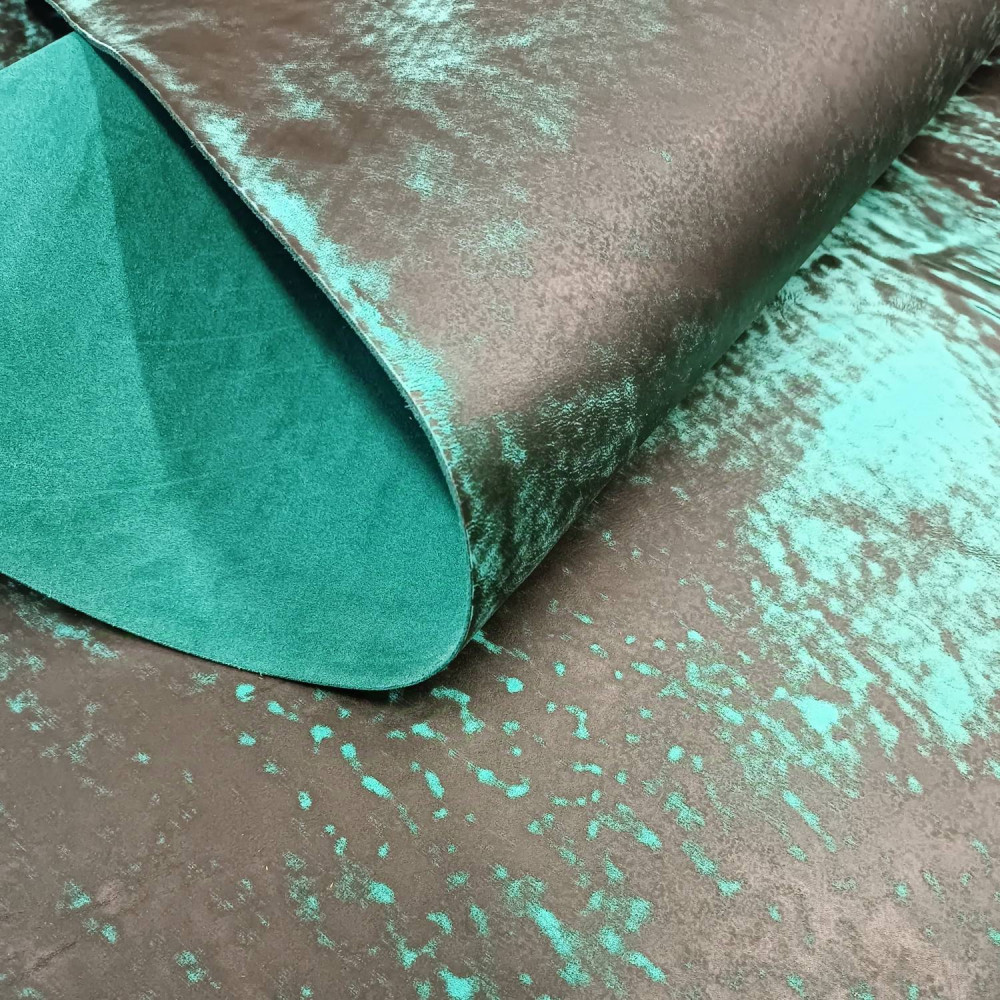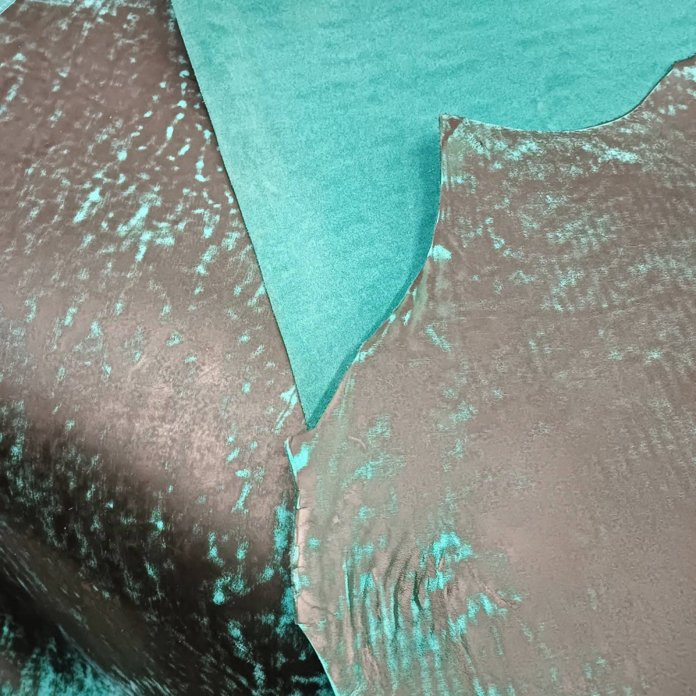 Кожа за счет особенностей обработки лицевой поверхности имеет оригинальный неповторимый узор. Сквозь Черный лицевой окрас поглядывает бирюзовая сквозная тонировка.