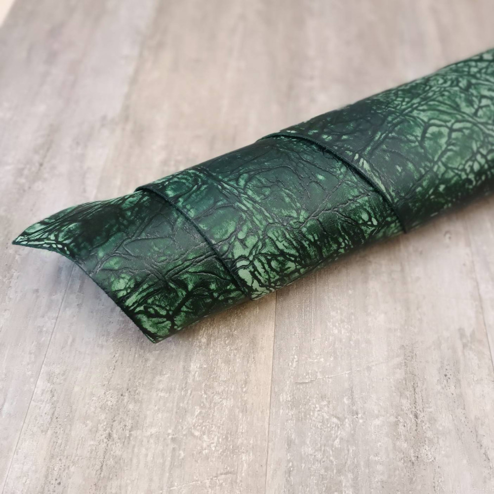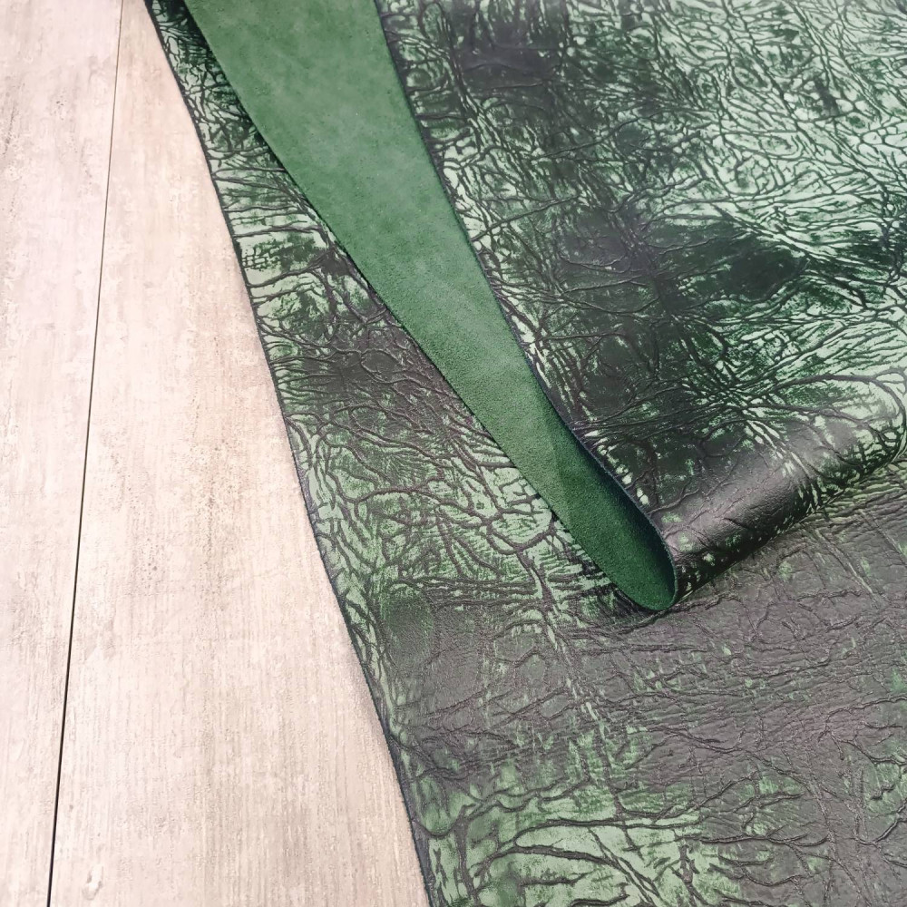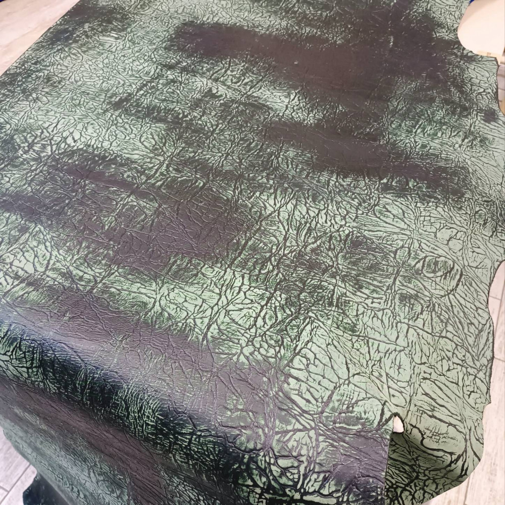 Кожа за счет особенностей обработки лицевой поверхности имеет оригинальный неповторимый узор. Сквозь темно зелёный лицевой окрас поглядывает зелёная сквозная тонировка.
