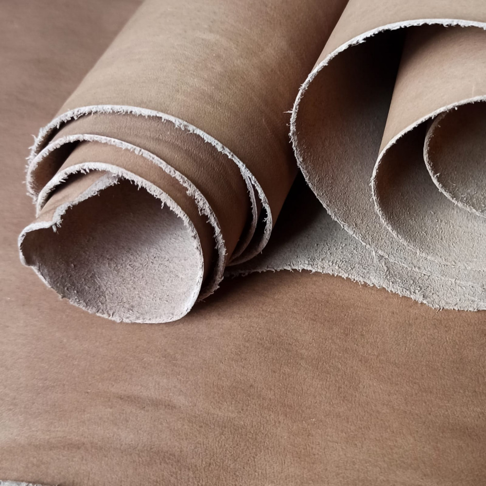 Пола без покрытия (в красте), производства Россия. Толщина 1,1-1,3. Подходит для изготовления ножен, ошейников, ремешков и прочих мелких изделий. В меру пластичная, не сухая, плотная. Бахтарма с низким ворсом. Сортность: без сорта.
