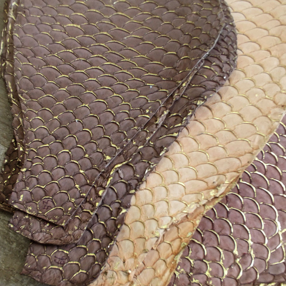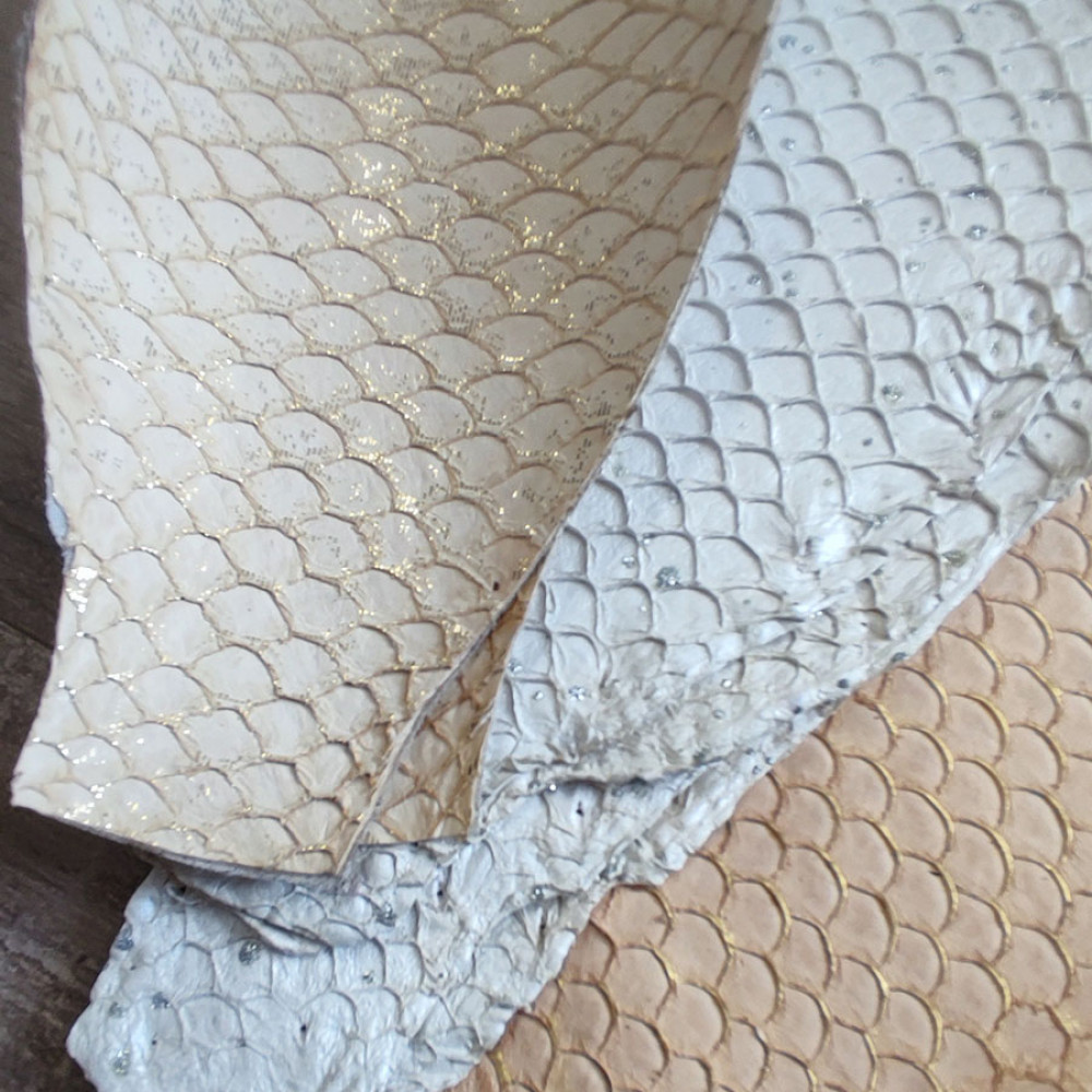 Кожа рыбы (карп) натуральная - матовая, пастельные оттенки. С позолоченными чешуйками. Толщина кожи 0,6-0,8. мм.