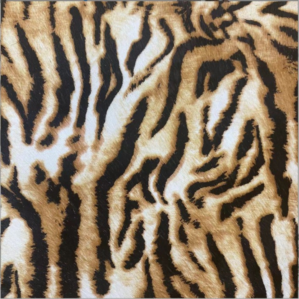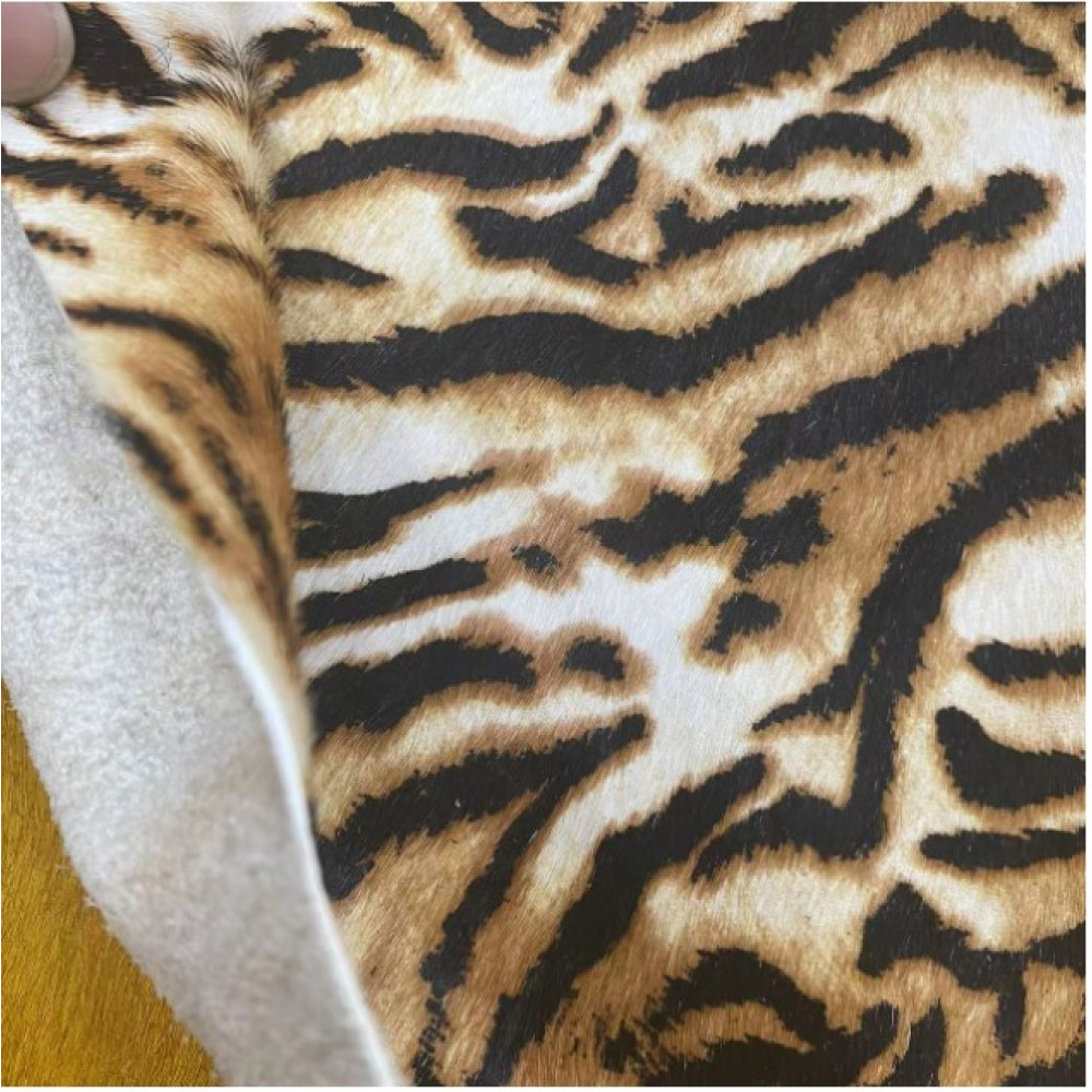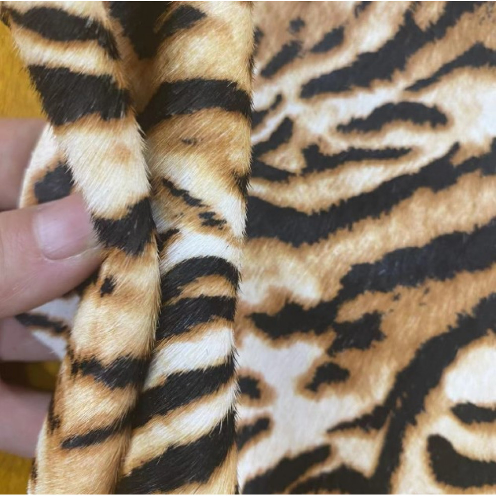 Натуральная кожа КРС с ворсом принт под тигра. Ворс гладкий, низкий. Мездра ровная, гладкая.