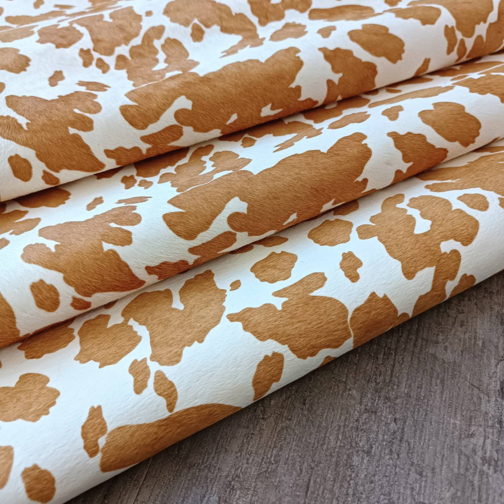 Натуральная кожа КРС с ворсом, принт под корову, светло коричнево -рыжие пятна на белом фоне. Ворс гладкий, очень низкий, под "бархат". Мездра ровная, гладкая.