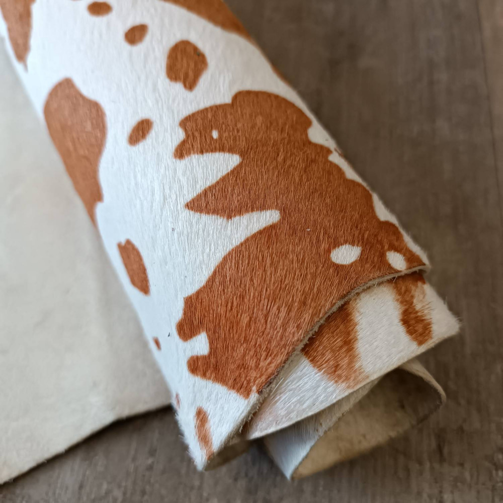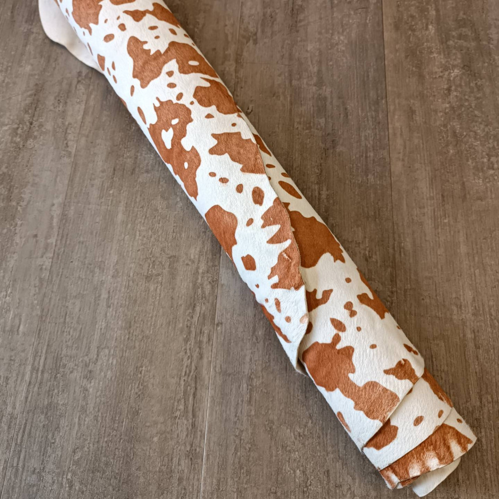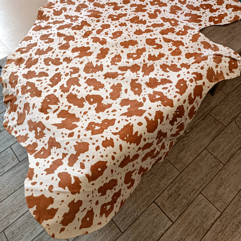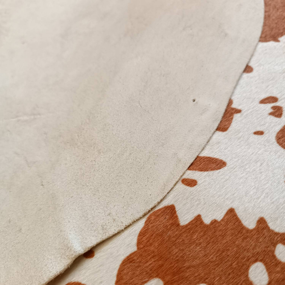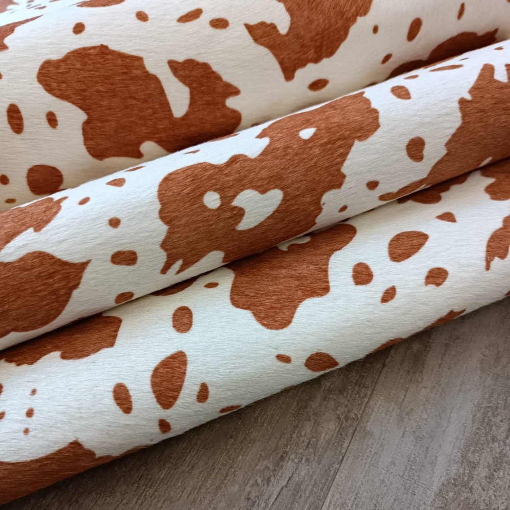 Натуральная кожа КРС с ворсом, принт под корову коричневые пятна на белом фоне. Ворс гладкий, очень низкий, под "бархат". Мездра ровная, гладкая.