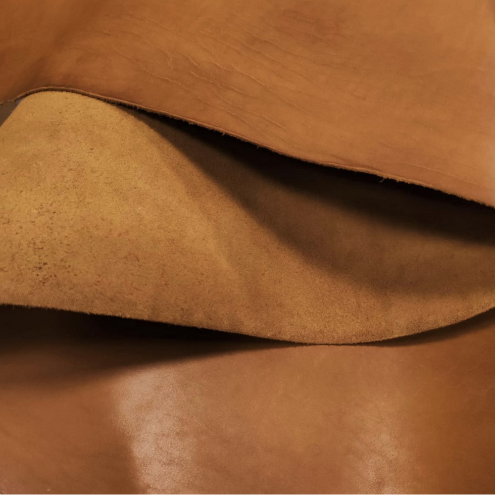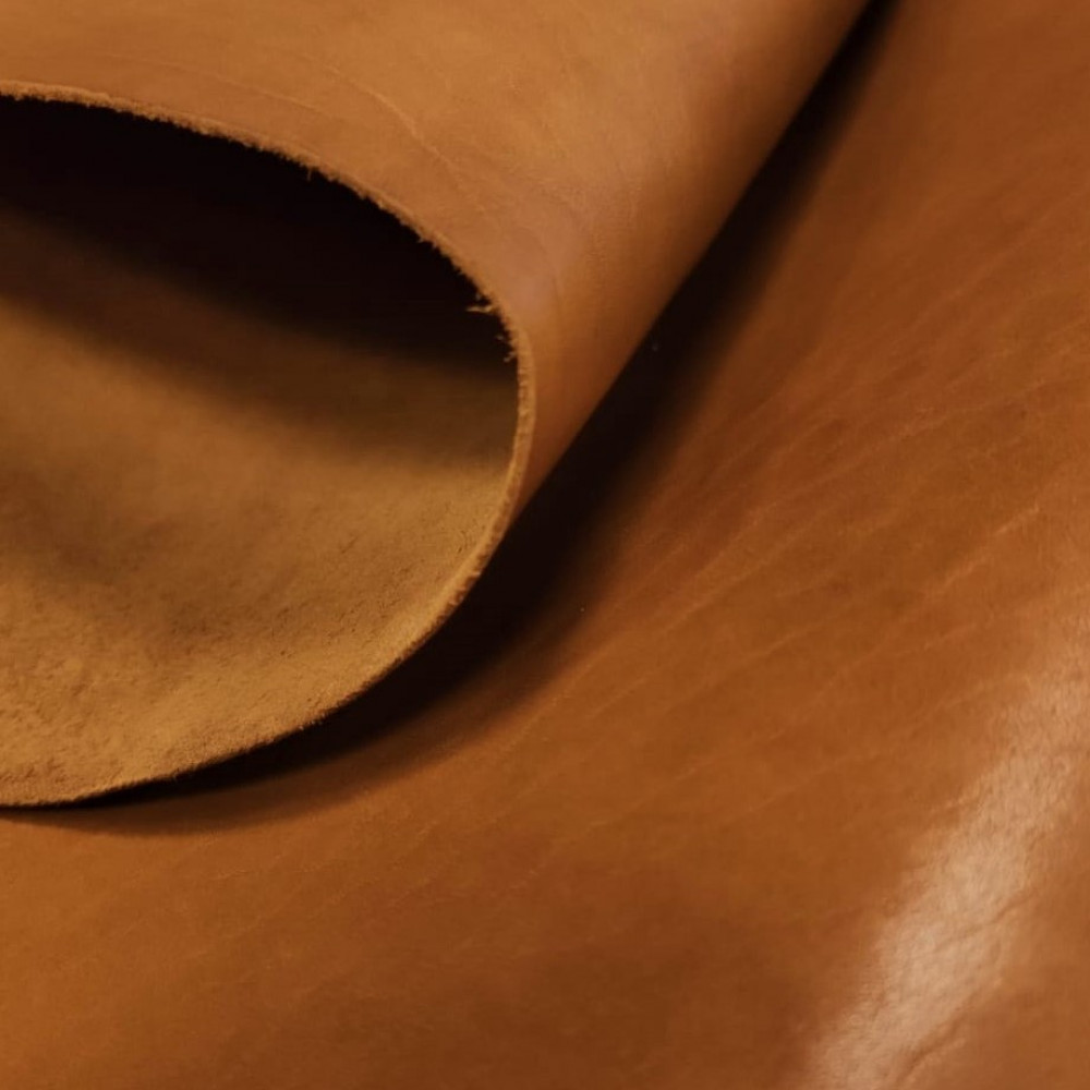 Шорно-седельная юфть барабанного крашения (сквозной окрас). Без покрытия. Бахтарма ровная и низким ворсом. Кожа плотная, держит форму. Без покрытия, подвергается обработке горячей плитой, благодаря чему лицо приобретает лощеный вид.