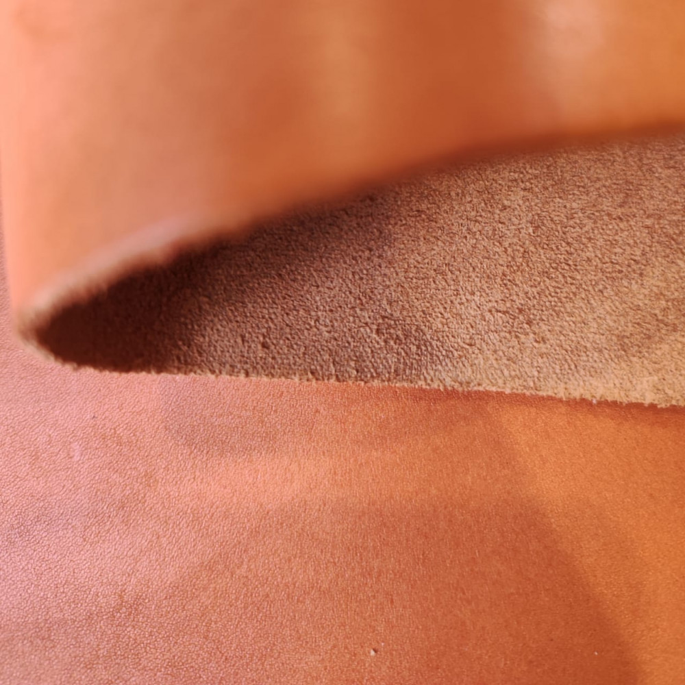 Шорно-седельная юфть барабанного крашения (сквозной окрас). Без покрытия. Цвет: желтый с тонировкой. Т.к. кожа тонированная, видно естественный узор кожи