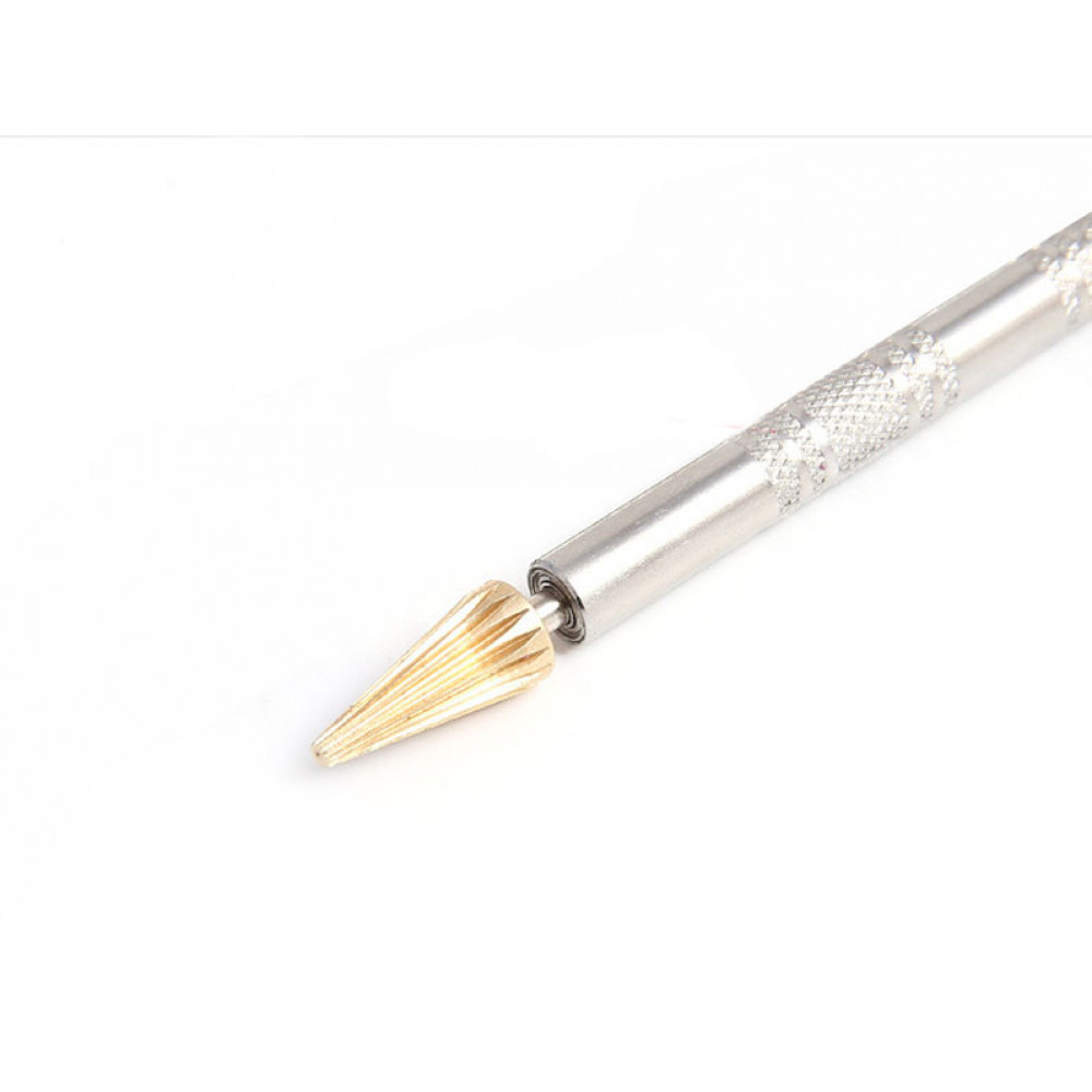 Ручку с вращающимся наконечником конической формы погружают в ёмкость с краской и проводят по урезу кожи, замши или ткани.