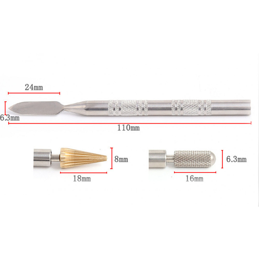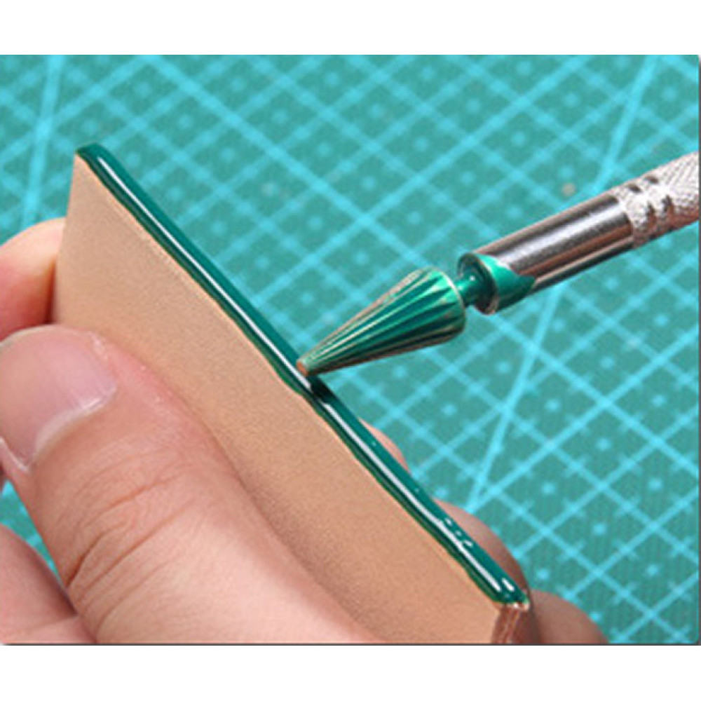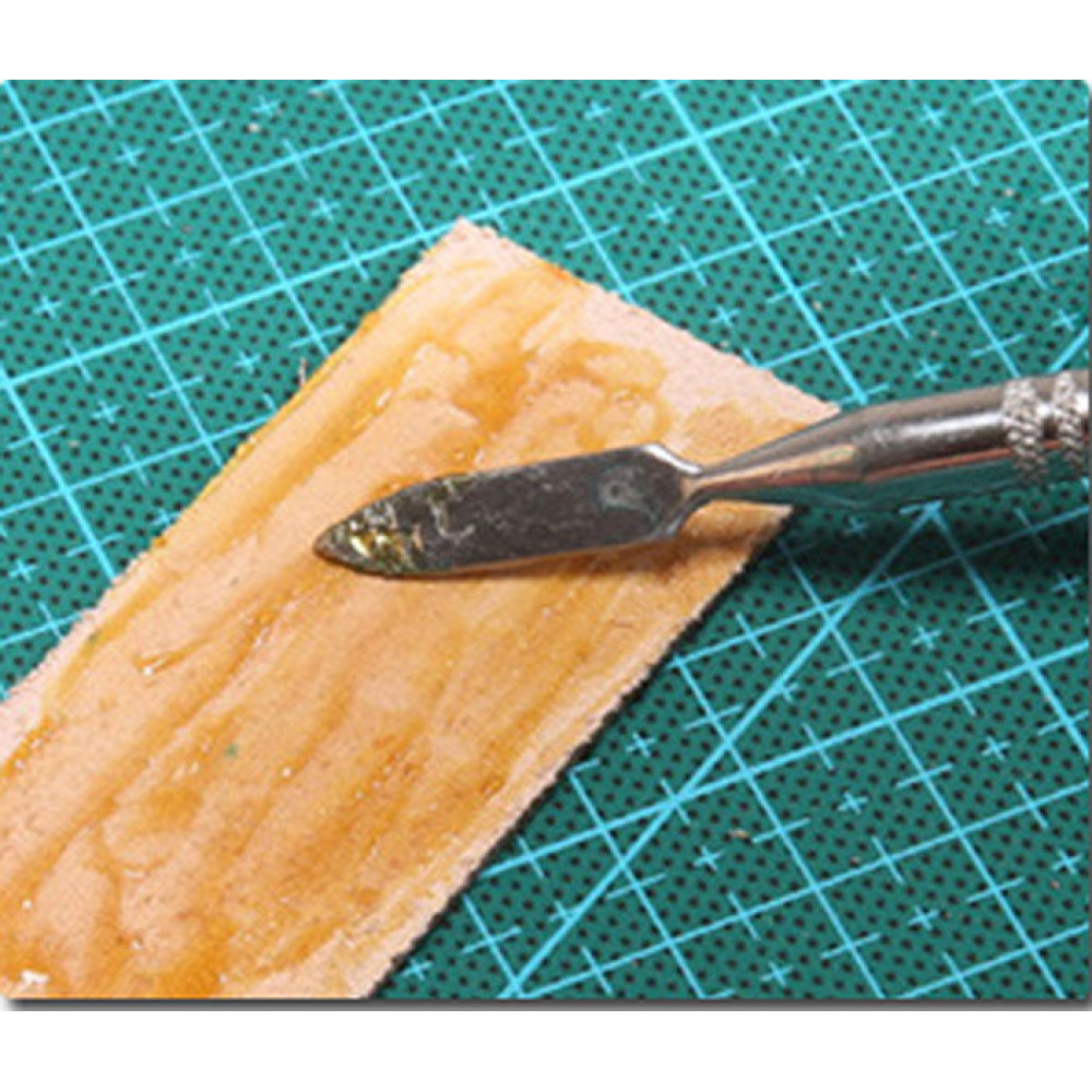 Инструмент двухсторонний - с одной стороны конус (цилиндр) для нанесения краски на урез кожи, с другой - шпатель для нанесения клея (химии) на кожу.