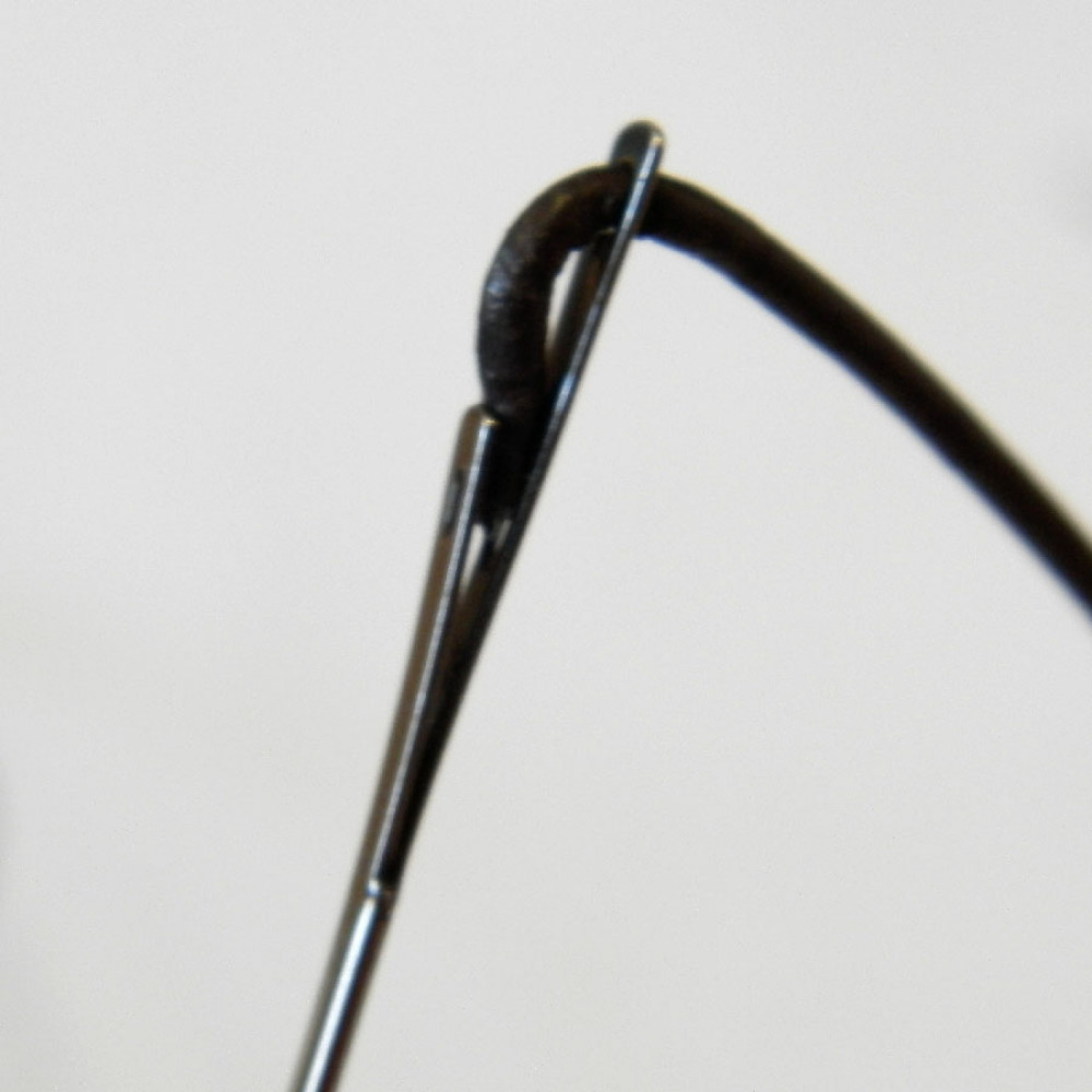 На видео можно посмотреть, как кожаный плоский шнур закрепляется в игле