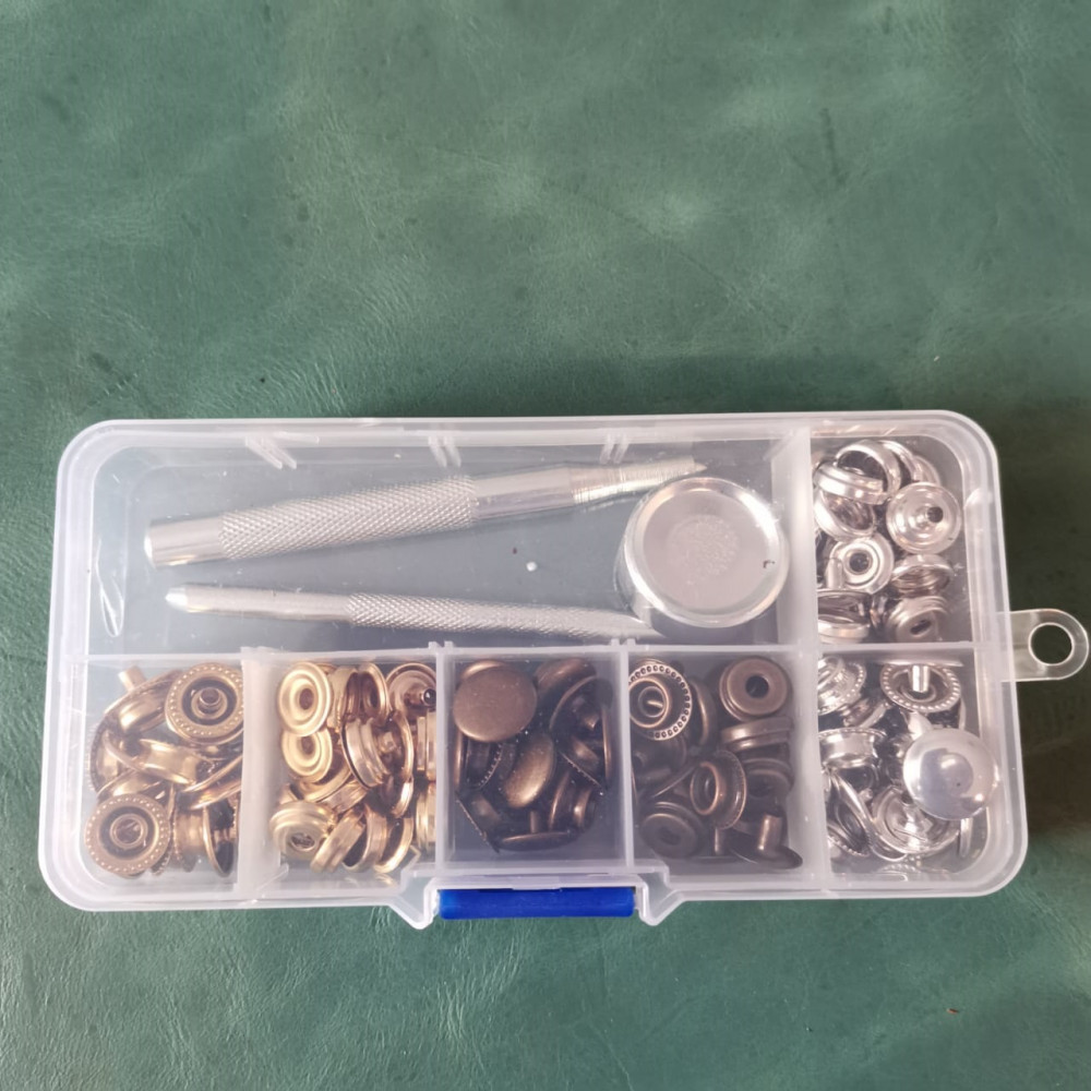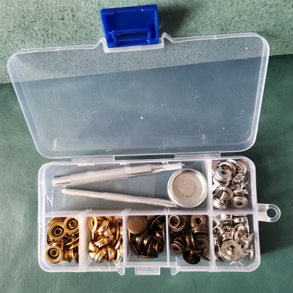 В наборе: 30 или 45 штук кнопок (состоят из четырех частей) 10(15) шт серебро, 10(15) шт бронза, 10(15) шт золото и инструмент для установки (установщик, плашка, пробойник)